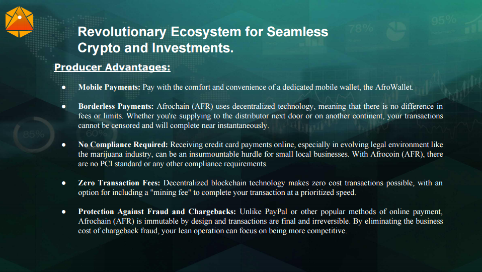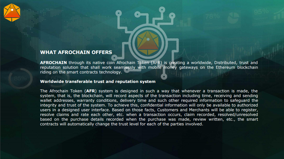 Встречайте первый блокчейн, чтобы создать свободную африканскую экономику: AFROCHAIN https://afrochain.co/ более 40% денежных переводов предназначены для конкретных целей, таких как еда, одежда, медицина, школьные сборы или счета за коммунальные услуги. Новый афрокейный токен (AFR) позволит отправителям приобретать цифровые ваучеры (AfroGifts), которые могут быть доставлены миллиардам получателей по всему миру мгновенно через SMS или электронную почту. Эти ваучеры могут быть потрачены непосредственно на товары и услуги из экосистемы торговцев AFROCHAIN, партнеров в их сообществе. Услуга значительно снизит стоимость передачи, предоставив получателю соответствующее значение в соответствии с рецептом. Трейдеры смогут принимать ETS на основе криптовалюты и обменивать их с традиционными (Fiat) валютами. Решение токена AFROCHAIN (AFR) позволит трейдерам и клиентам участвовать в глобальной распределенной торговле с общим доверием.