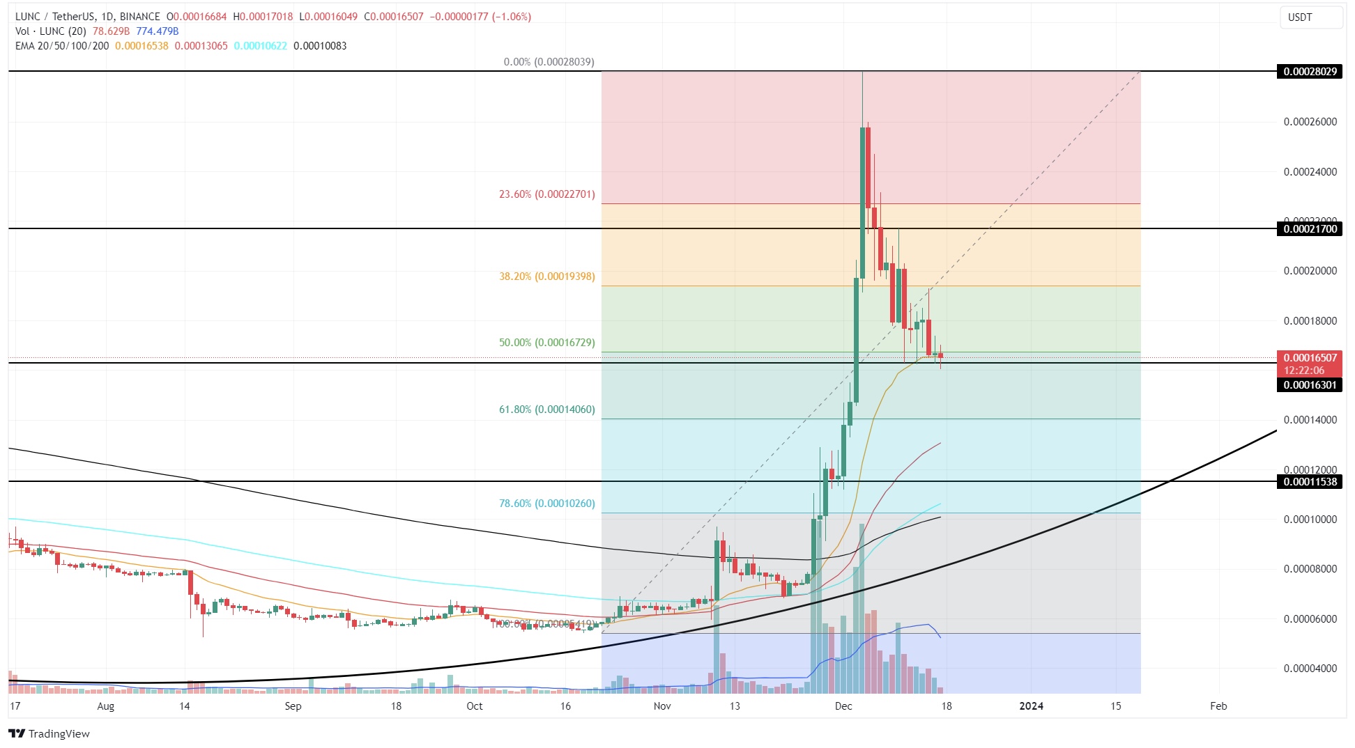 Amid the prevailing market volatility, the Terra Classic price experienced a significant downturn, retreating from the $0.00028 level. Over two weeks, the altcoin plummeted by 42.6%, finally finding reliable support at $0.00016.