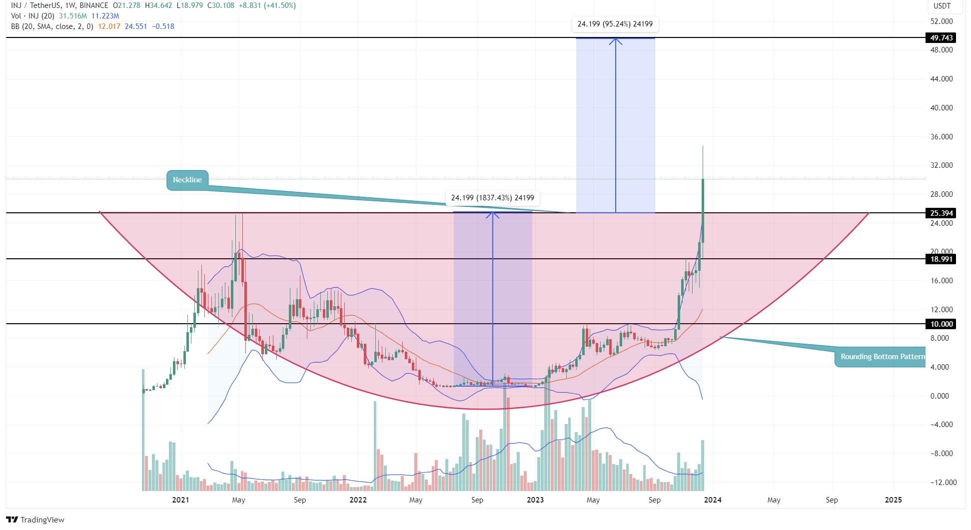 In the weekly timeframe, Injective (INJ) displays a rounding bottom pattern, which, along with a broader market upswing, has contributed to a gradual increase throughout the year. The coin’s recovery accelerated in late October, culminating in a decisive breach of the $25.4 resistance on December 13.