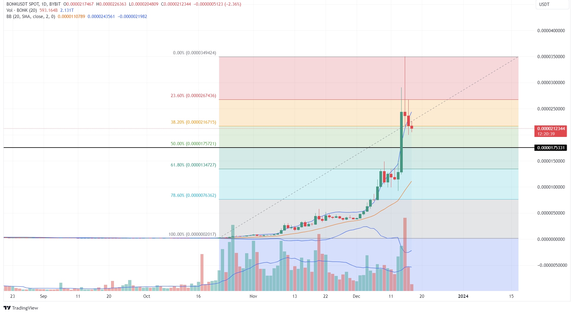 This surge gained further momentum following announcements of listings on major cryptocurrency exchanges. However, the BONK price is currently undergoing a correction phase, dropping its value by 38% to $0.0000216.