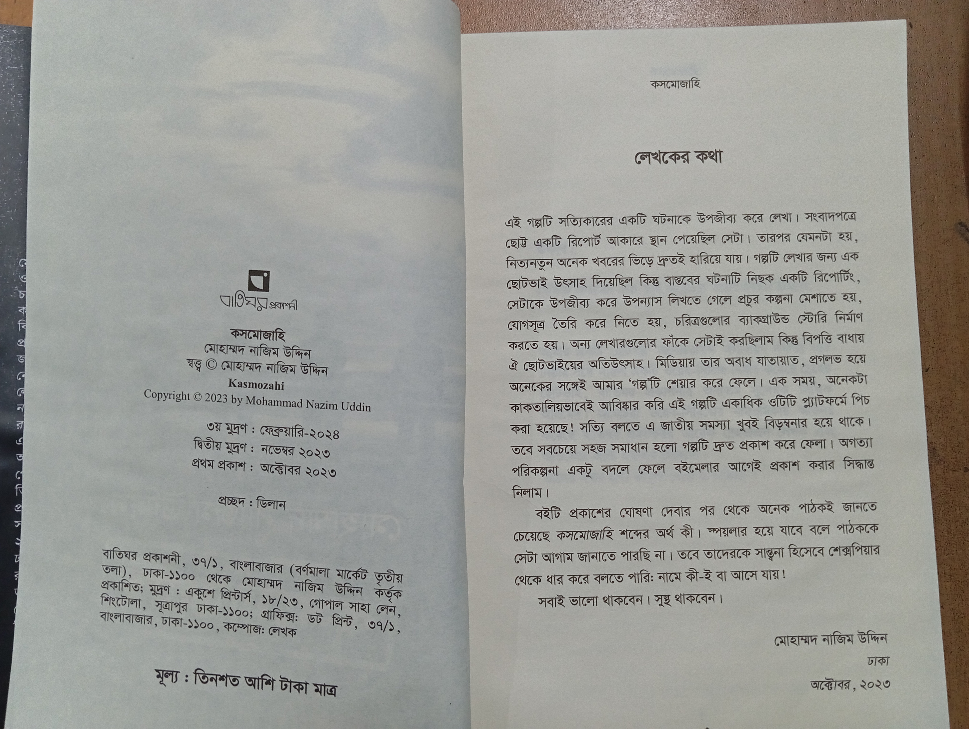 কোন বই কখনও খারাপ হয় না। তবে সাইকোলজিক্যাল থ্রীলার এবং ক্রাইম থ্রীলারের প্রতি আমার আলাদা একটা ভালো লাগা কাজ করে। এবং বর্তমানে ক্রাইম থ্রীলার লেখক হিসেবে মোহাম্মদ নাজিম উদ্দিন খুবই জনপ্রিয়। বিশেষ করে তার রবীন্দ্রনাথ এখানে কখনও খেতে আসেননি বই প্রকাশ হলে কলকাতায় উনি জনপ্রিয়তা অর্জন করেন। কসমোজাহি উনার অসাধারণ একটা বই। পুরোটা পড়ে আমার কাছে বেশ ভালো লেগেছে। আপনাদের যাদের ক্রাইম থ্রীলার পছন্দ তারা বইটা পড়তে পারেন।