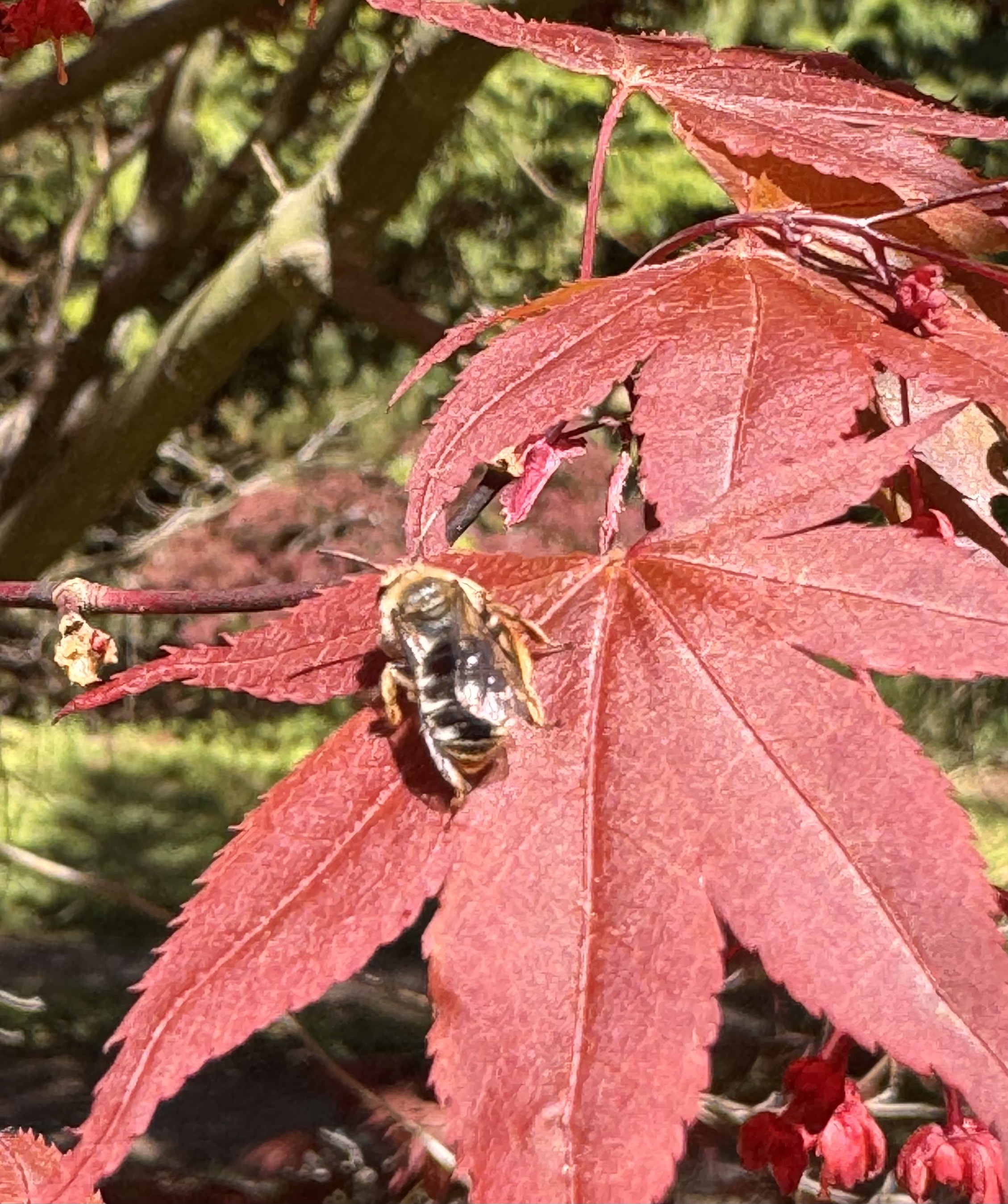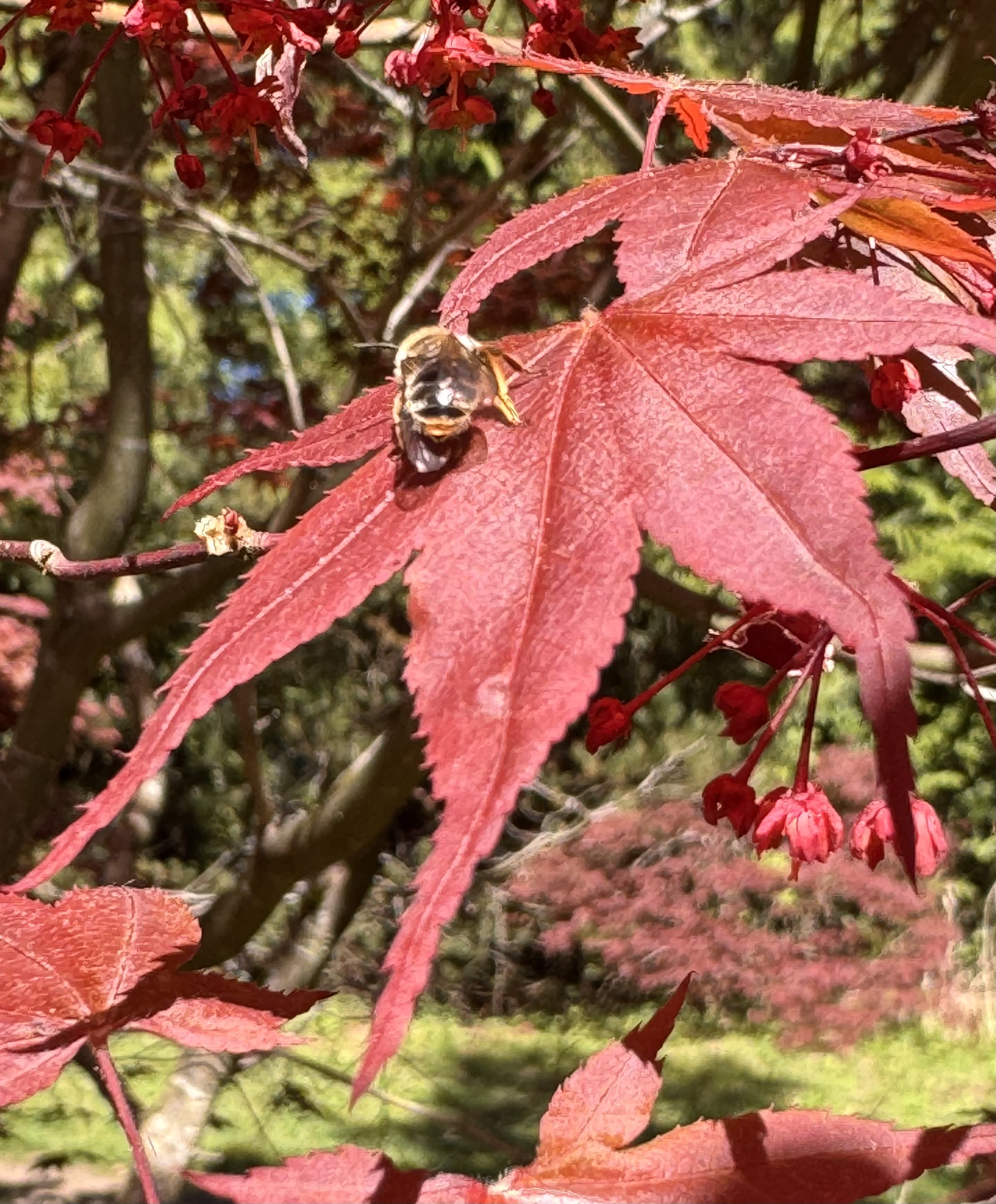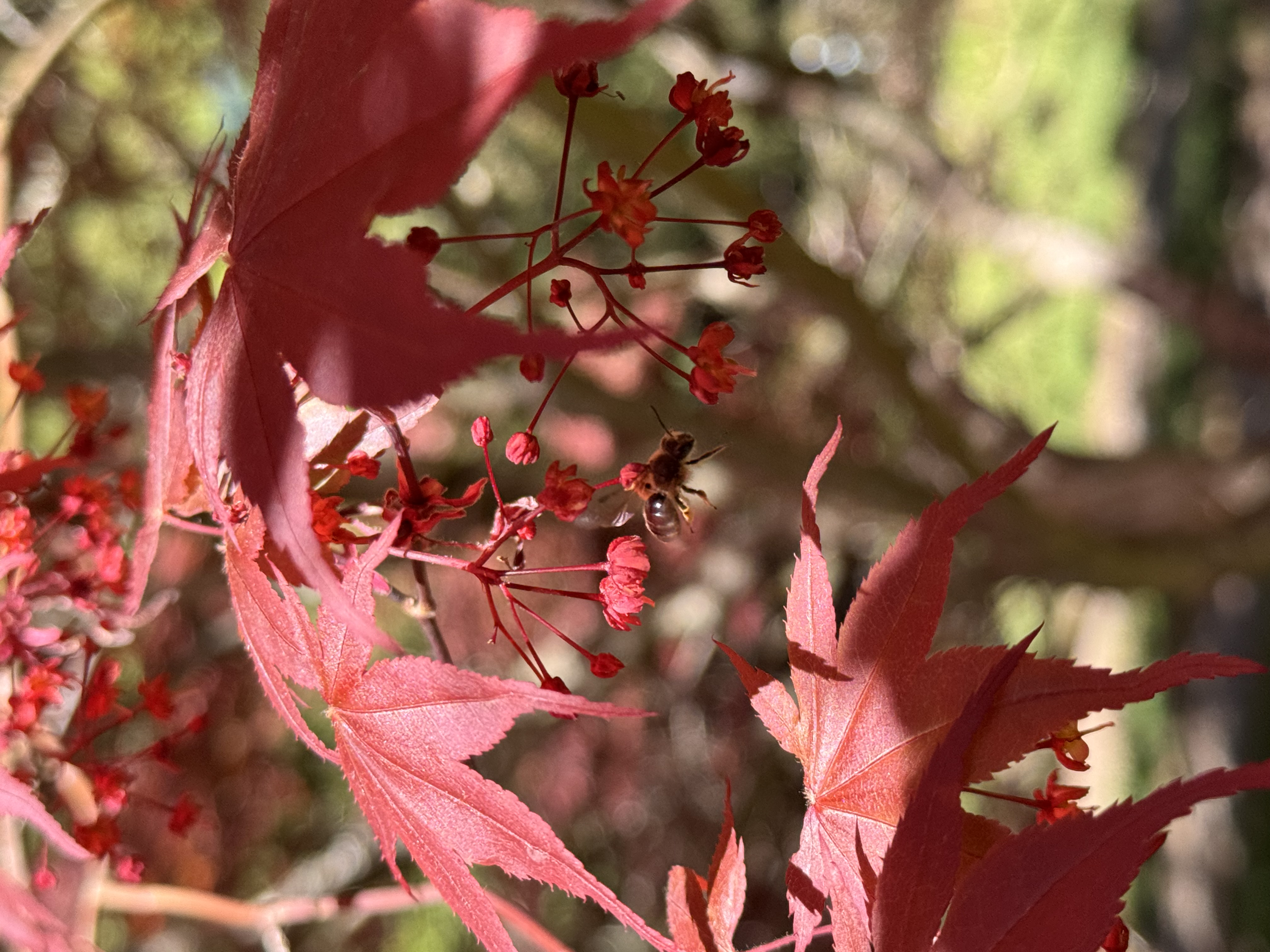 If you remember my post from a couple of days ago, I mentioned that the Bloodgood Japanese Maple tree would be buzzing soon with bee 🐝 activity because of the tiny flowers it has. It’s buzzing!