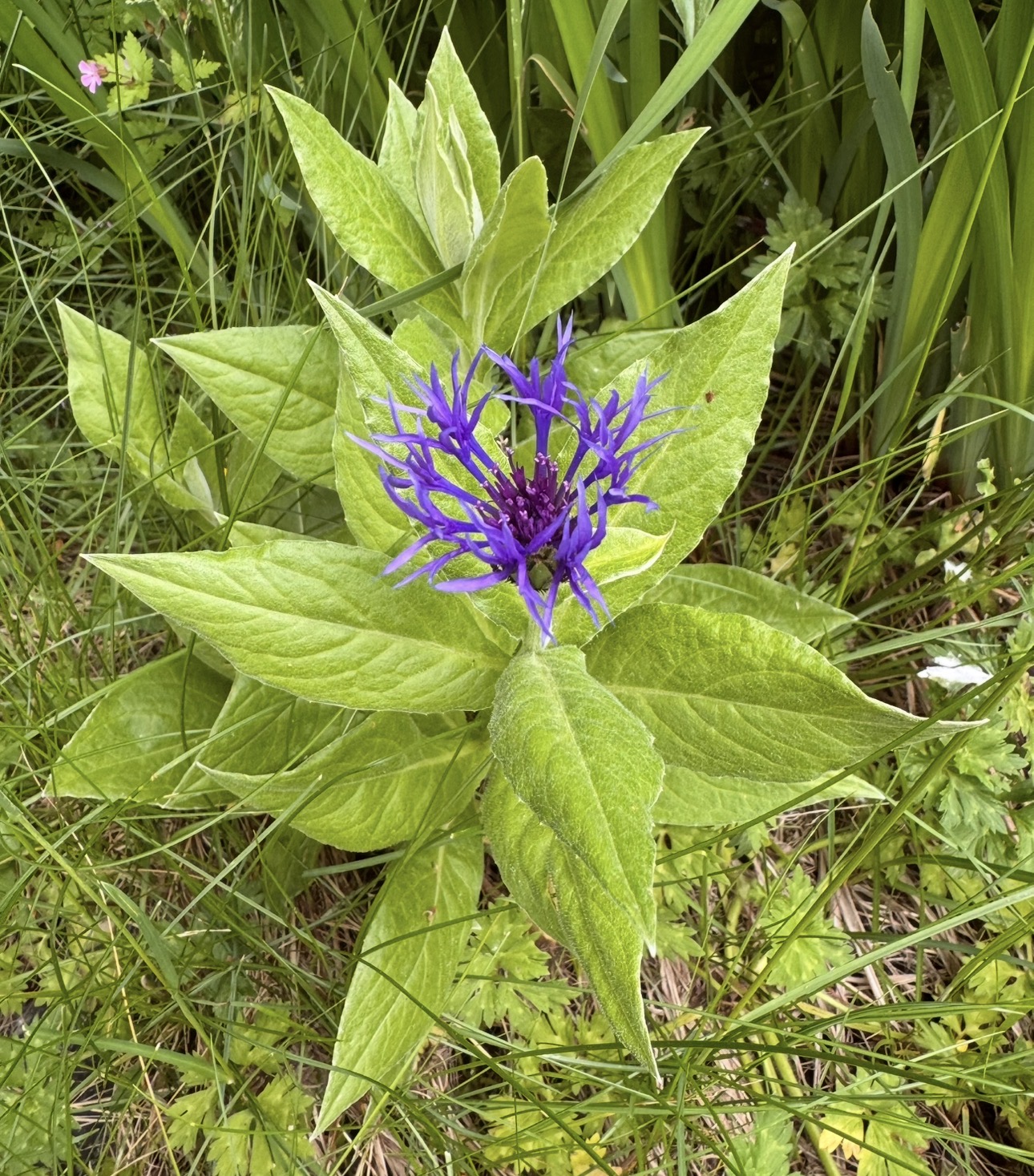 This flower is just beginning to emerge. Every year, these grow near the utility pole housing our entrance cable. When in full bloom, they are delicate and very purple. Google calls it Centaurea montana, also known as a perennial corn flower.