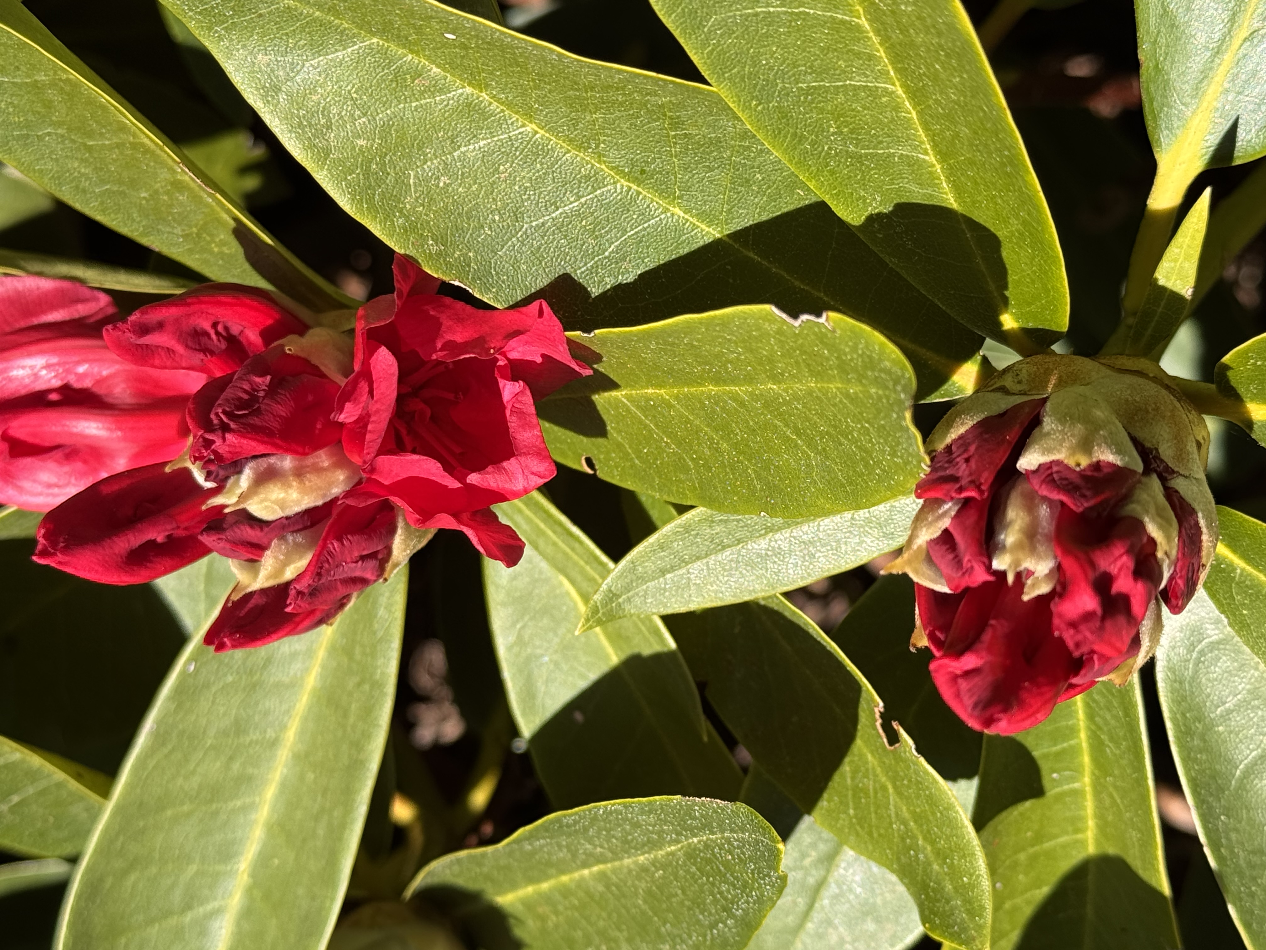The very first picture is of the brilliant orange/yellow azalea almost in bloom. This next one is of the first blooms of the rhododendron near the house.