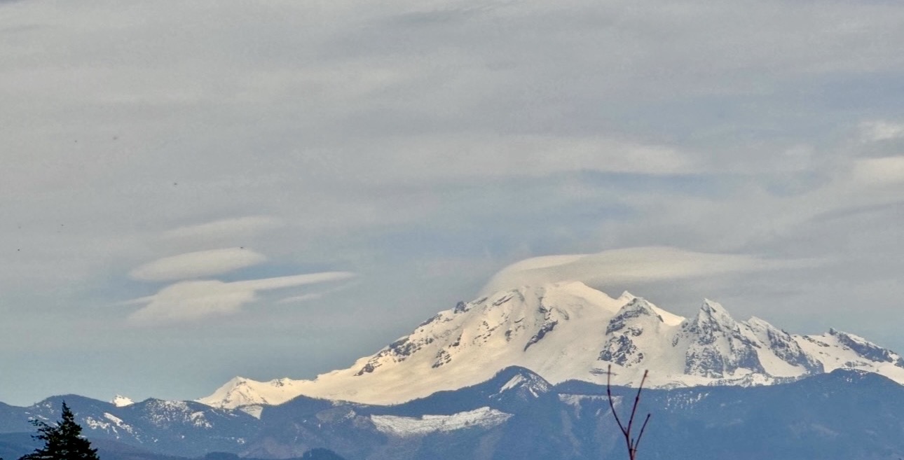 We woke up to sunshine this morning. That’s always nice for in the Pacific Northwest, due to the oceanic influence, you never know what to expect. It can change on a dime. Here’s a pic of Mt. Baker from the other day when it wasn’t so sunny.