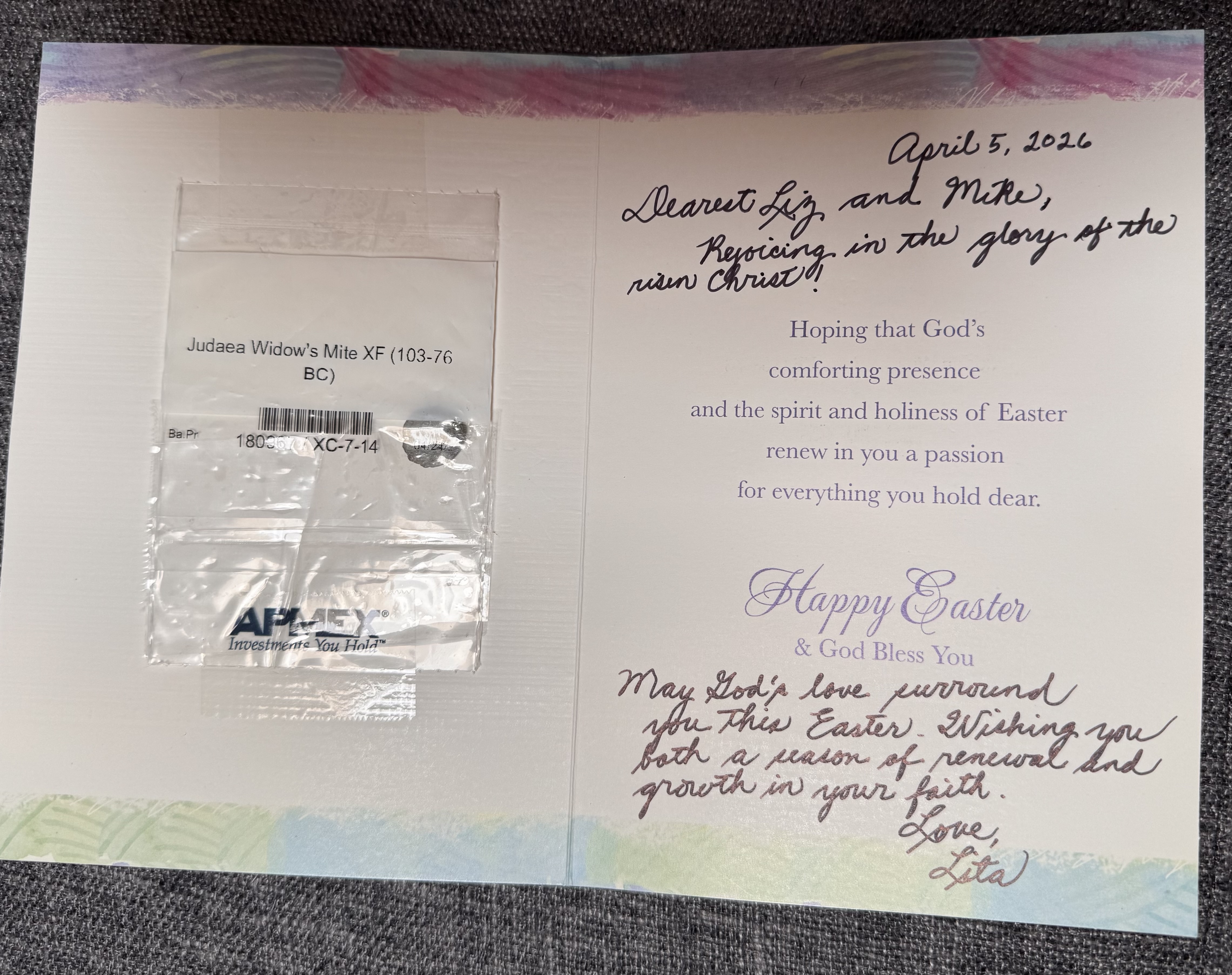 @silversaver888 also included this at the top-“Dearest Liz and Mike, rejoicing in the glory of the risen Christ!” At the bottom she wrote- “May God’s love surround you this Easter. Wishing you both a season of renewal and growth in your faith. Love, Lita.”