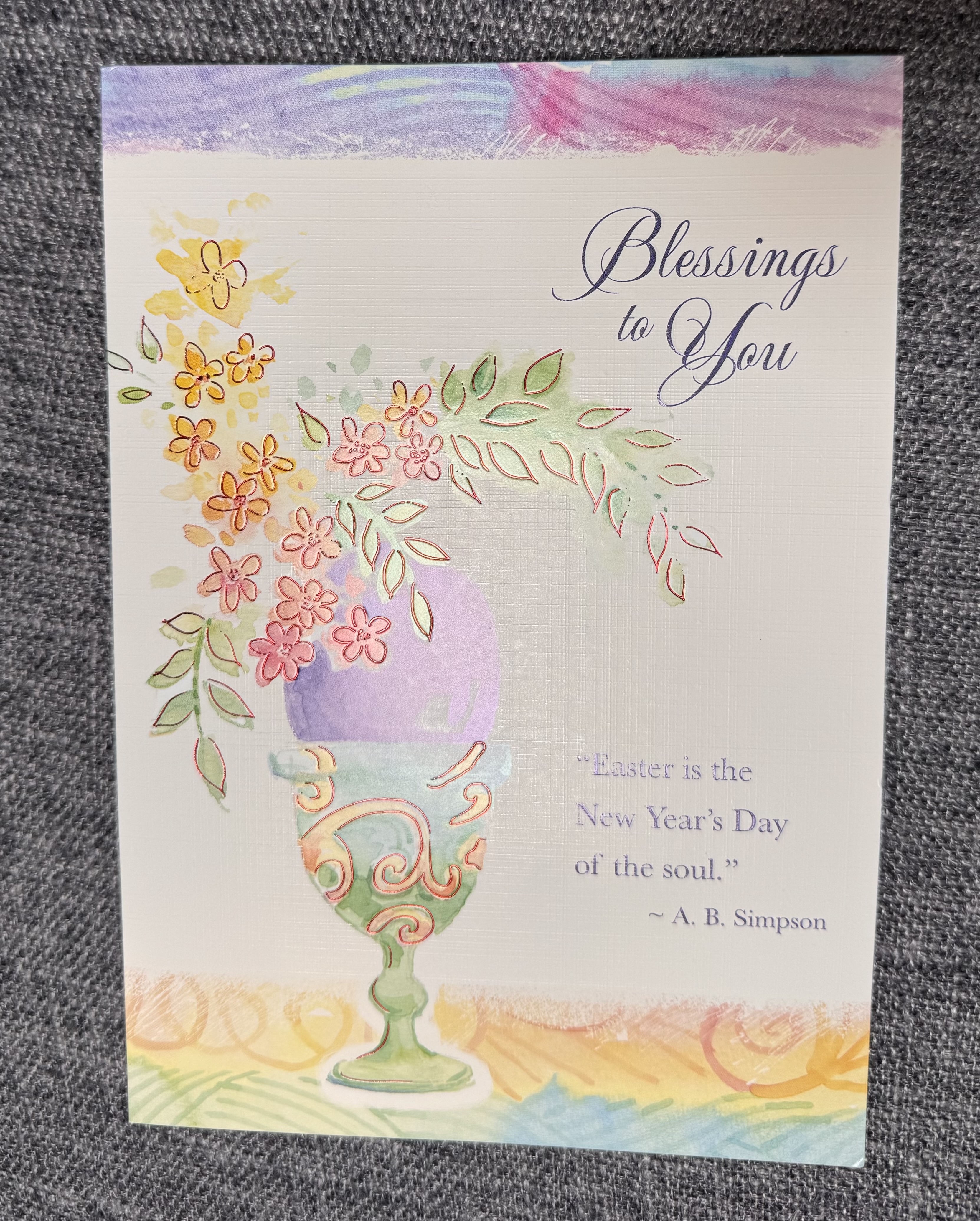 “Blessings to You”. And, then it says “Easter is the New Year’s Day of the soul”. -A. B. Simpson.