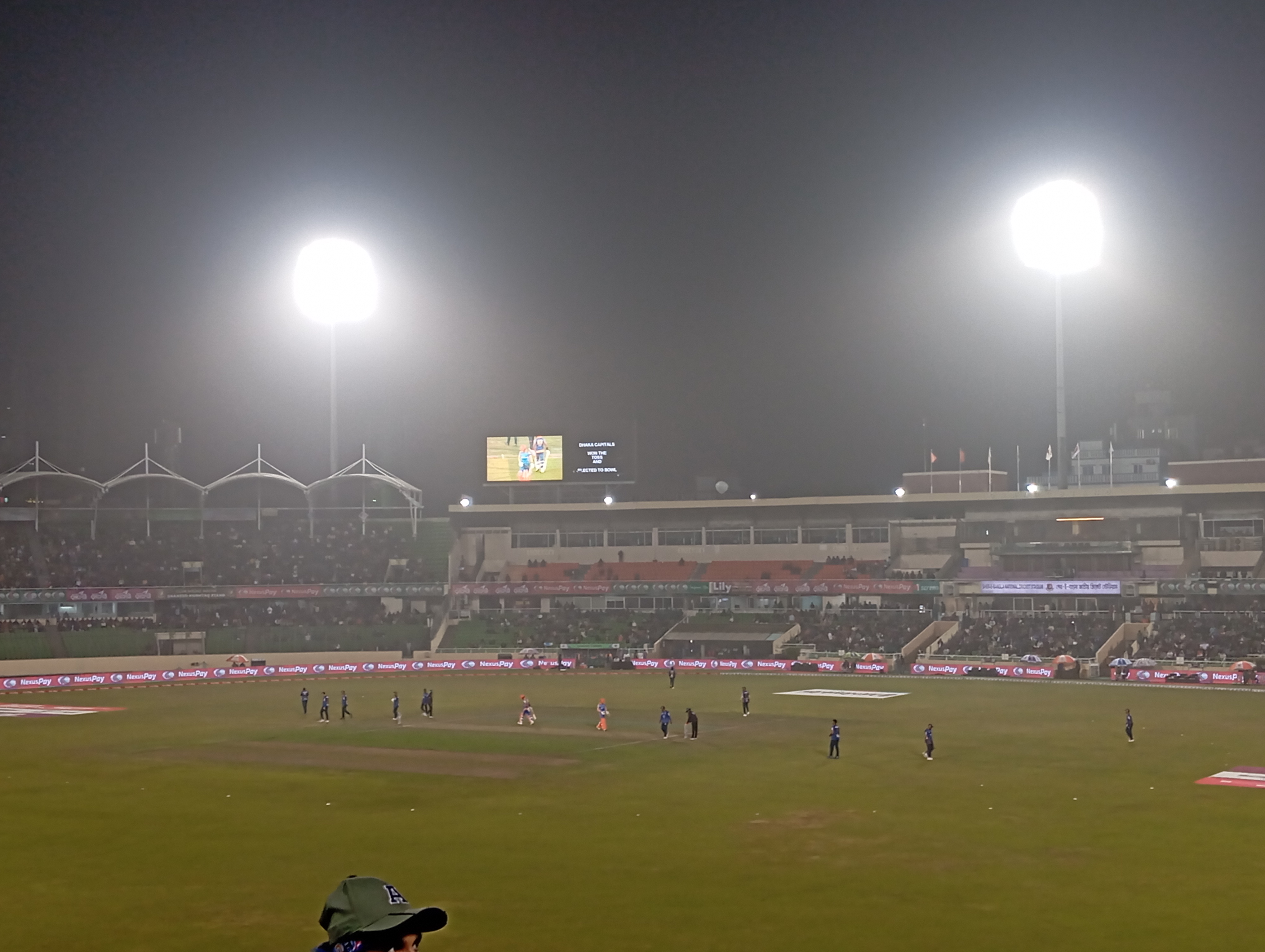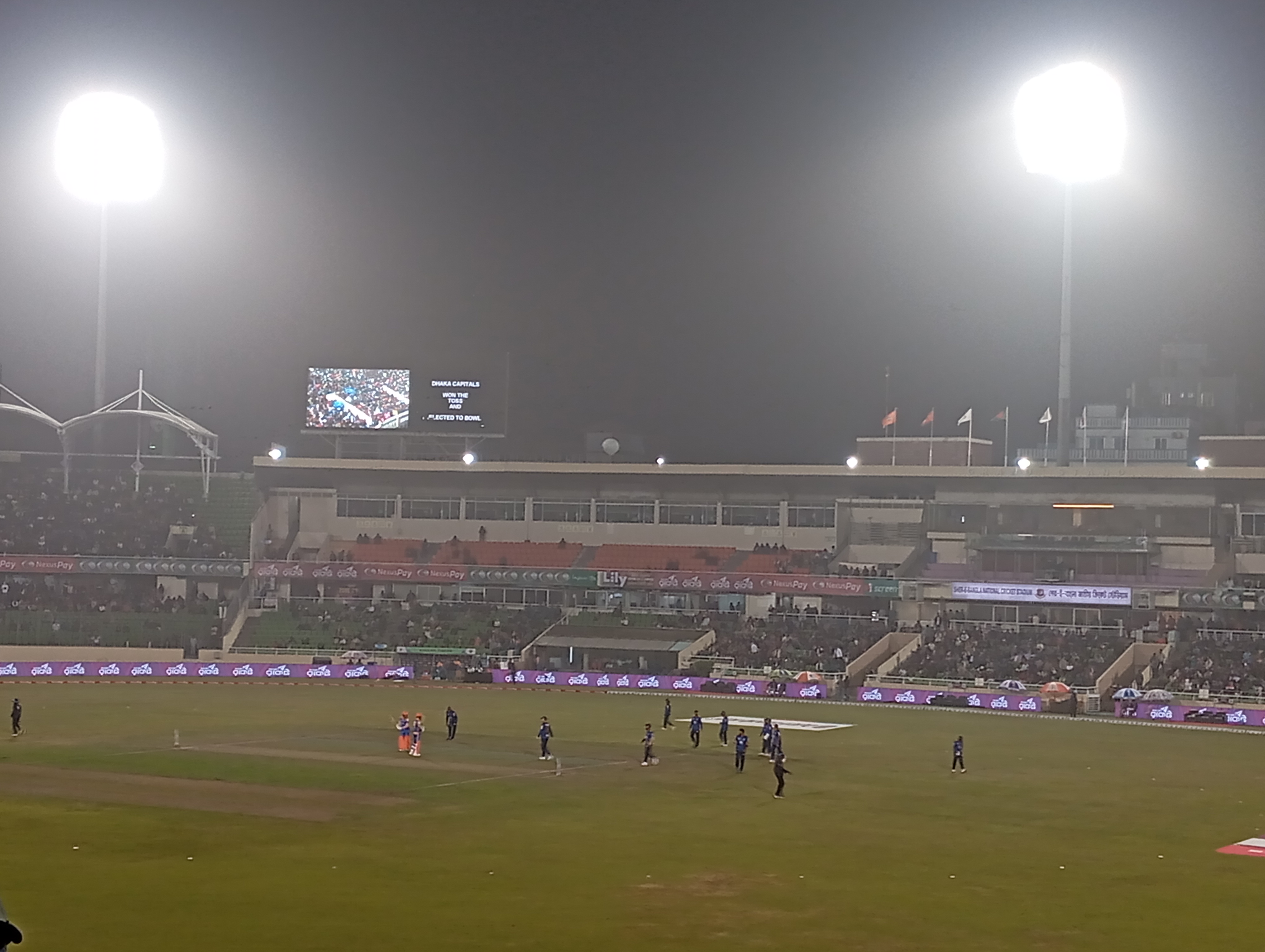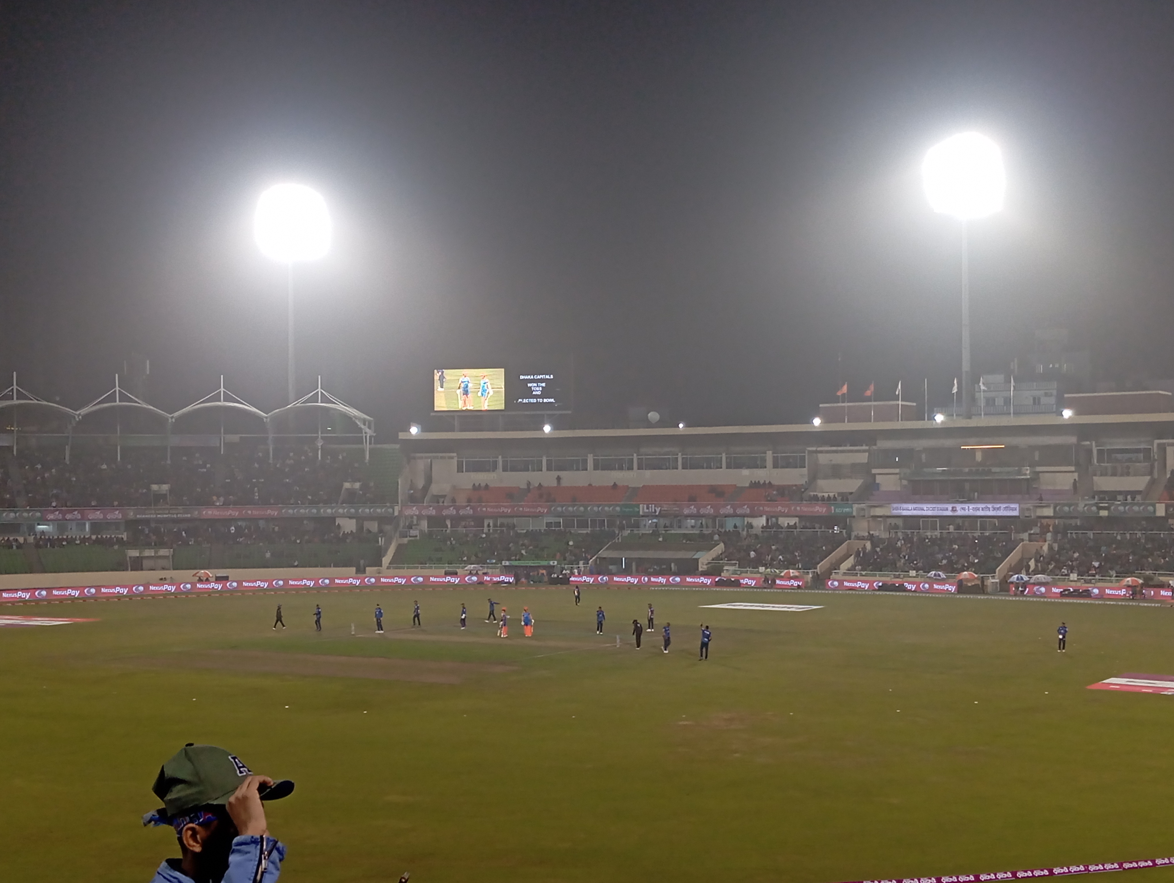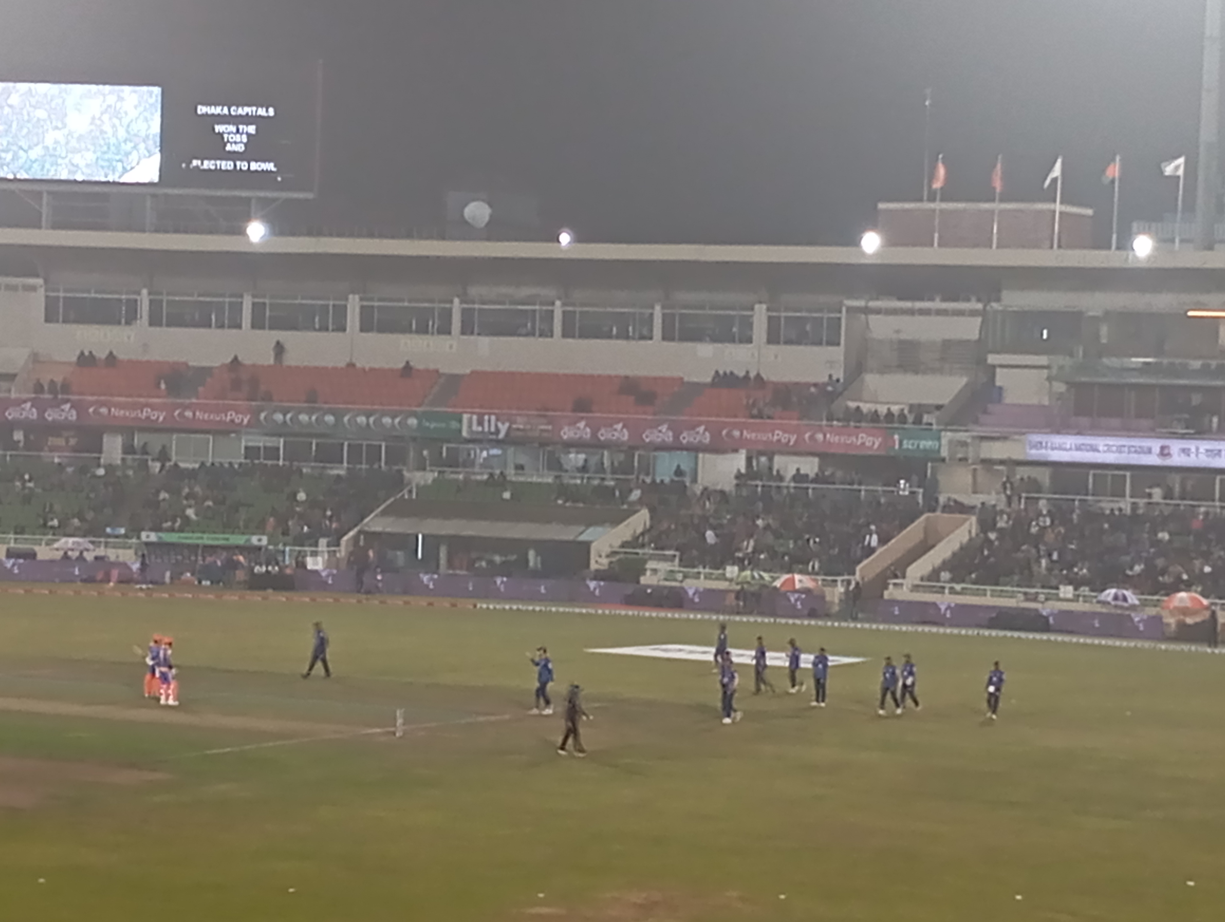 স্টেডিয়ামের ভেতরে গিয়ে দেখি প্রথম ম্যাচের দ্বিতীয় ইনিংস চলছে। যেখানে উসমান খানের সেঞ্চুরিতে বড় সংগ্রহ পেয়েছে চট্টগ্রাম অন্যদিকে টার্গেটে খেলতে নেমে রীতিমতো নাজেহাল অবস্থা রাজশাহীর। পুরো ম্যাচ খেলতে পারেনি রাজশাহী। বেশ কয়েক ওভার বাকি থাকতেই অলআউট হয়ে যায়। এবং বিশাল এক জয় পেয়ে যায় চট্টগ্রাম। এরপর আমরা আমাদের পছন্দমতো একটা সিটে বসি। আমরা চারজন পাশাপাশি বসি। তবে তখনও ম্যাচ শুরু হতে প্রায় ঘন্টাখানেক বাকি। ঐসময় খেলোয়ার রা মাঠে অনুশীলন করছিল আমরা সেটা দেখছিলাম। ওয়েদার বেশ ঠান্ডা ছিল। ঠান্ডা কাটানোর জন্য কফি খাই। এতে করে মোটামুটি কাজ হয়। কিছুক্ষণ আমরা নিজেদের মধ্যে গল্প করি। এরপর টস হয়। টসে ঢাকা ক্যাপিটালস জিতে বোলিং এর সিদ্ধান্ত নেয়।