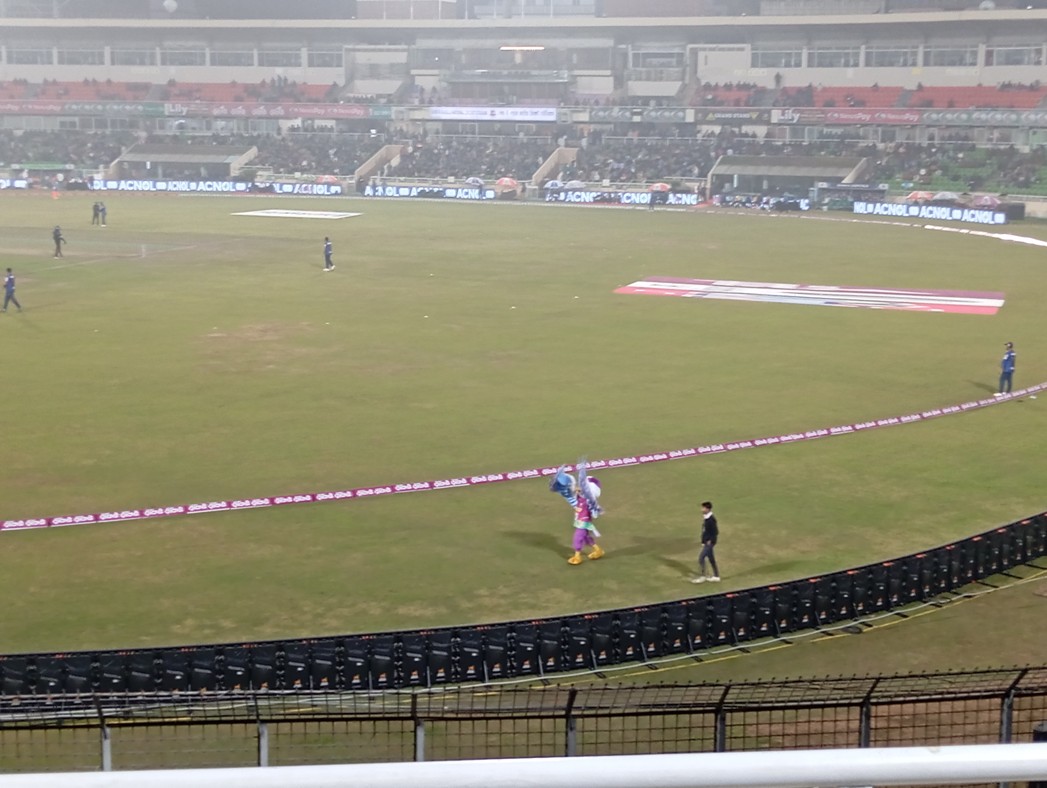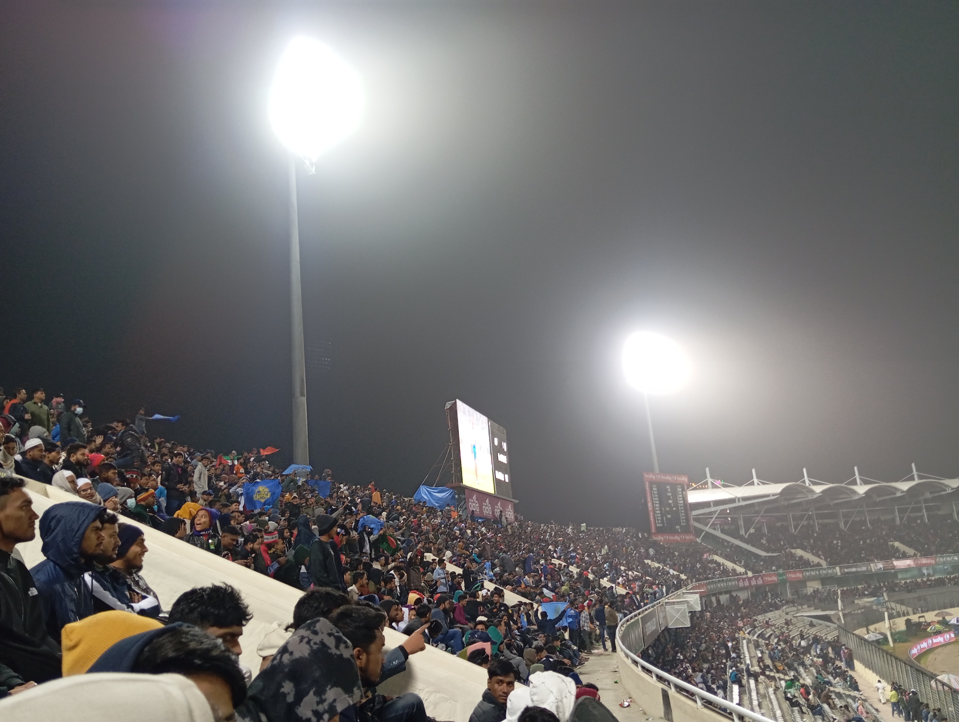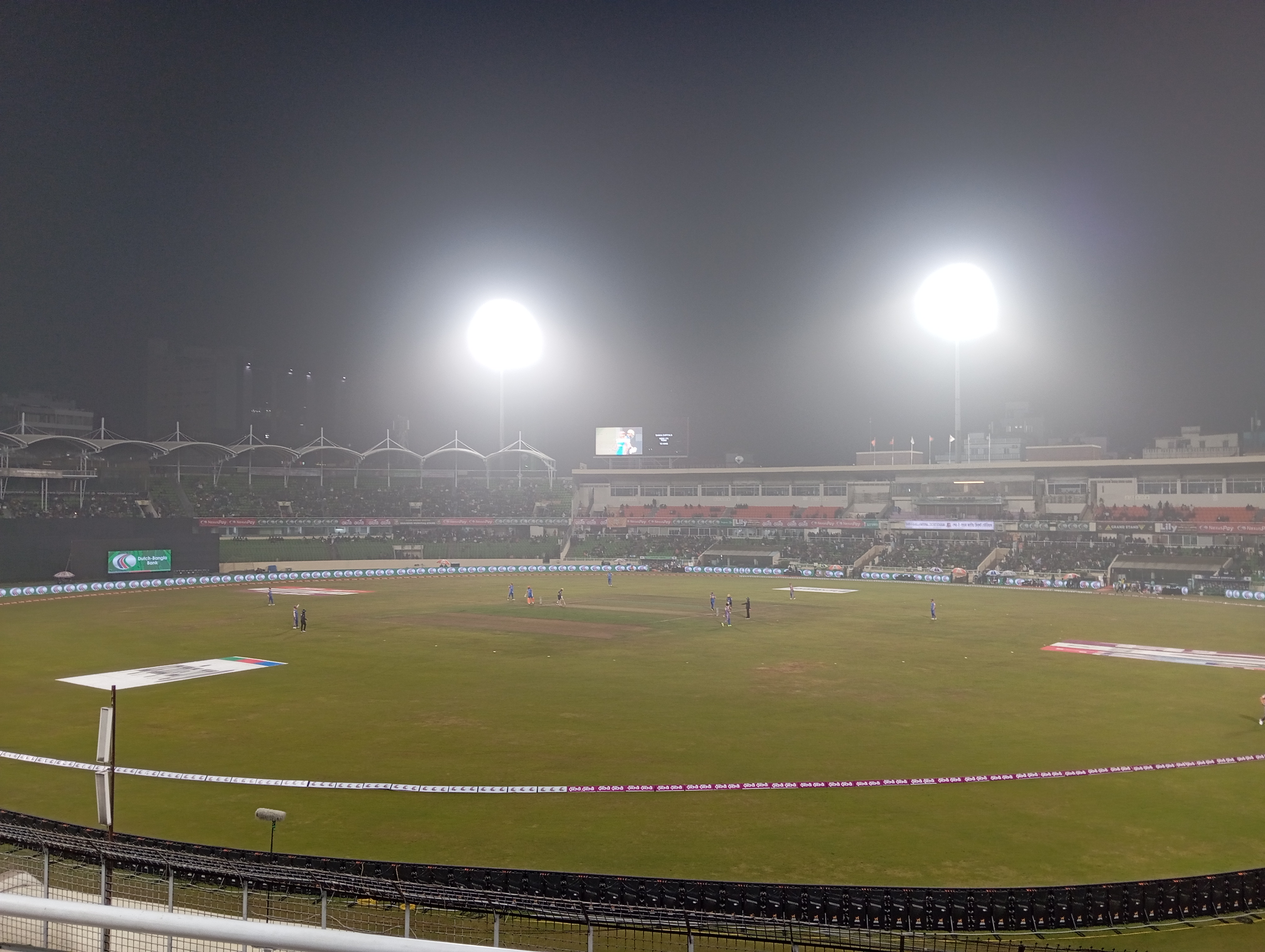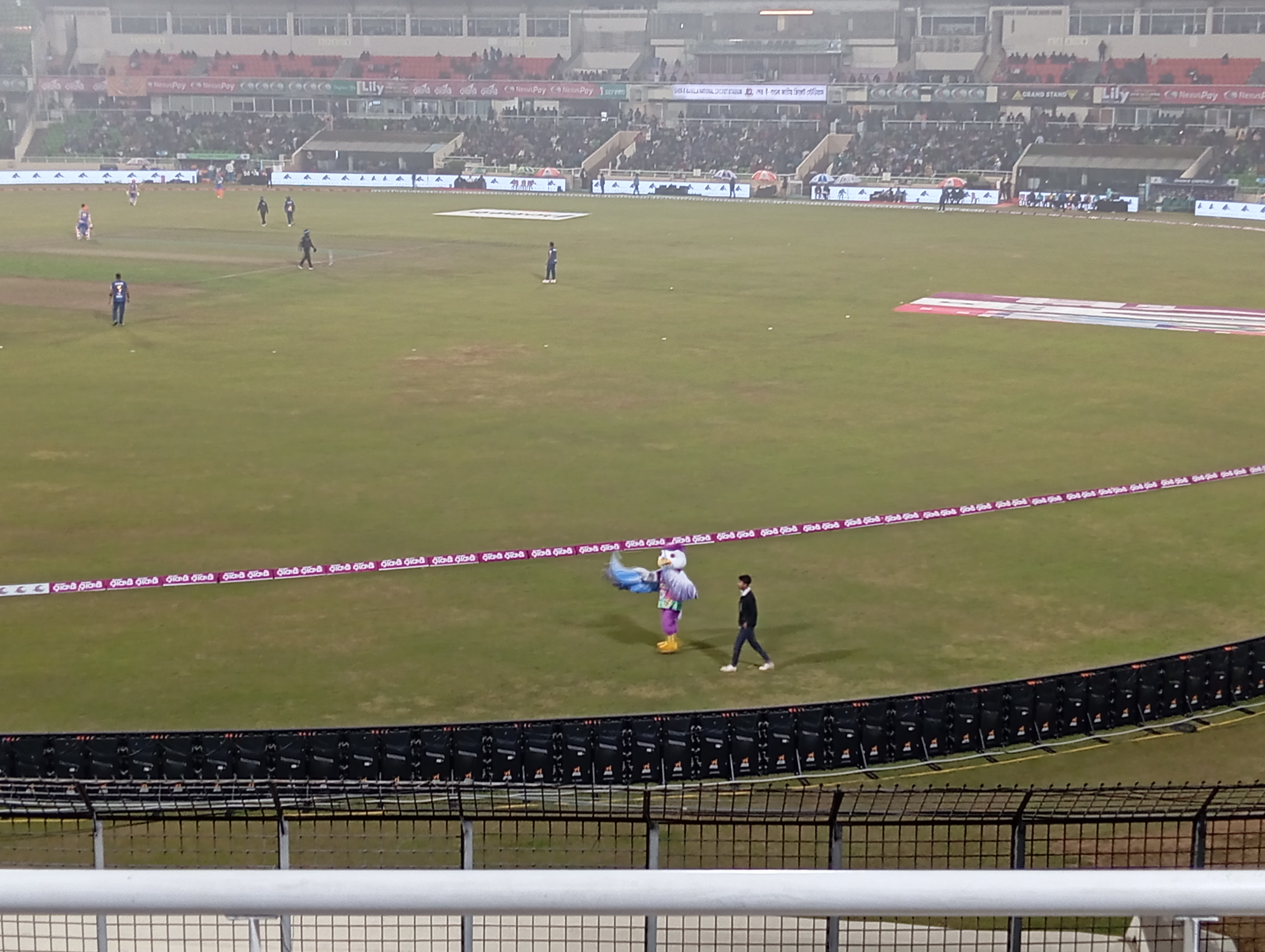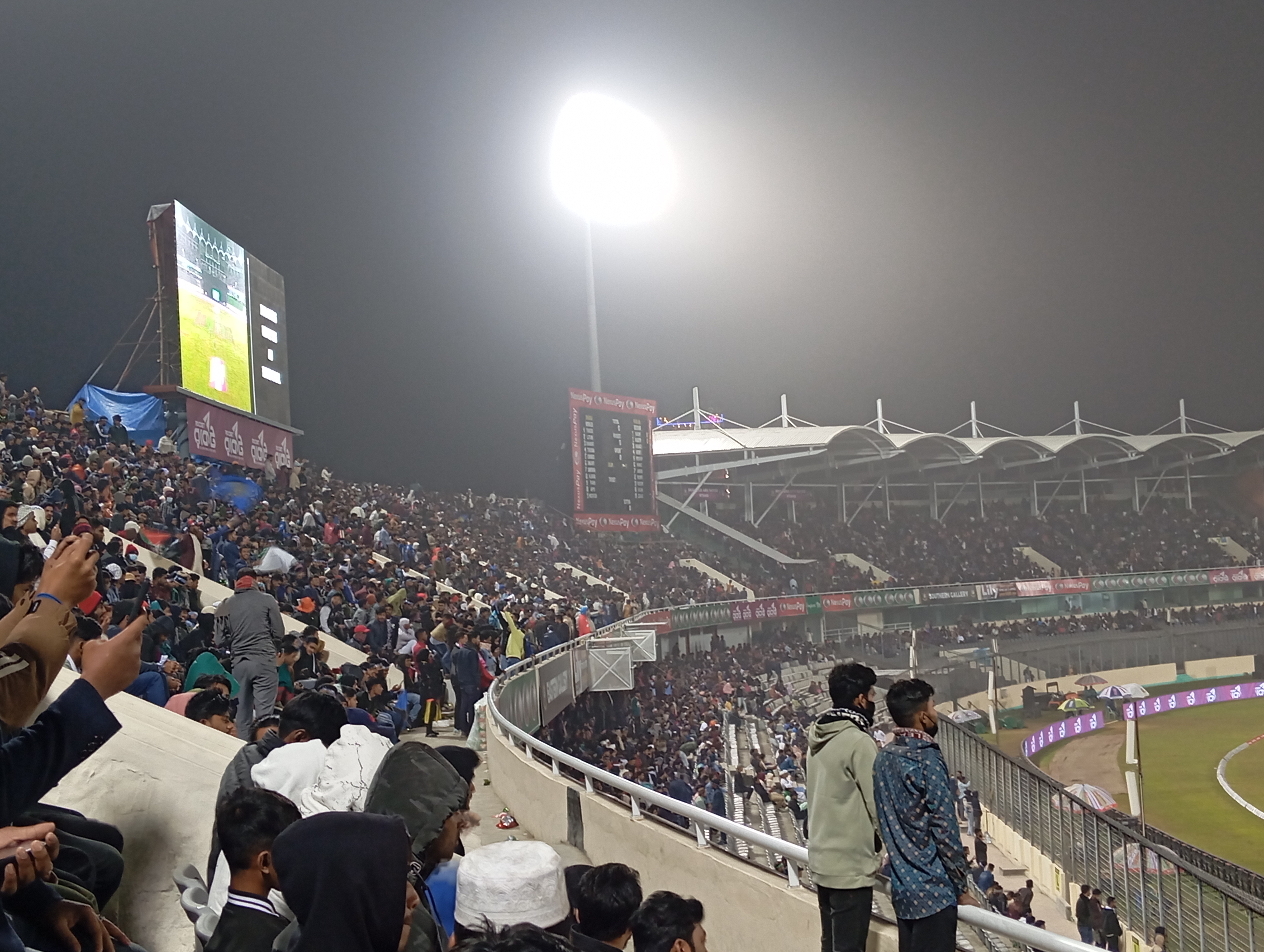 স্টেডিয়ামের ভেতরে গিয়ে দেখি প্রথম ম্যাচের দ্বিতীয় ইনিংস চলছে। যেখানে উসমান খানের সেঞ্চুরিতে বড় সংগ্রহ পেয়েছে চট্টগ্রাম অন্যদিকে টার্গেটে খেলতে নেমে রীতিমতো নাজেহাল অবস্থা রাজশাহীর। পুরো ম্যাচ খেলতে পারেনি রাজশাহী। বেশ কয়েক ওভার বাকি থাকতেই অলআউট হয়ে যায়। এবং বিশাল এক জয় পেয়ে যায় চট্টগ্রাম। এরপর আমরা আমাদের পছন্দমতো একটা সিটে বসি। আমরা চারজন পাশাপাশি বসি। তবে তখনও ম্যাচ শুরু হতে প্রায় ঘন্টাখানেক বাকি। ঐসময় খেলোয়ার রা মাঠে অনুশীলন করছিল আমরা সেটা দেখছিলাম। ওয়েদার বেশ ঠান্ডা ছিল। ঠান্ডা কাটানোর জন্য কফি খাই। এতে করে মোটামুটি কাজ হয়। কিছুক্ষণ আমরা নিজেদের মধ্যে গল্প করি। এরপর টস হয়। টসে ঢাকা ক্যাপিটালস জিতে বোলিং এর সিদ্ধান্ত নেয়।