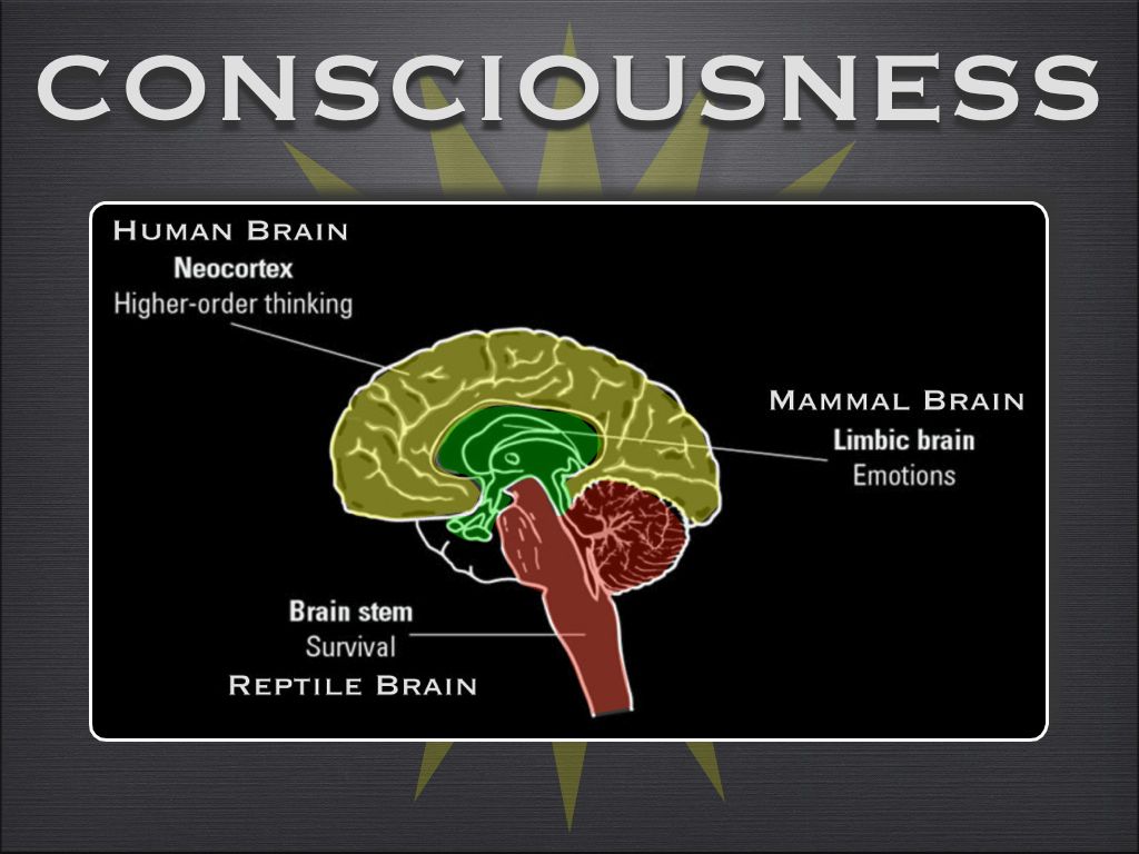 The Reptile brain (the R-Complex), is the lowest part of the brain, or the brain stem. It is responsible for controlling our motor skills and instinctive behaviours, such as our survival instinct and our "fight or flight" responses. It is the lowest form of consciousness, or base consciousness.