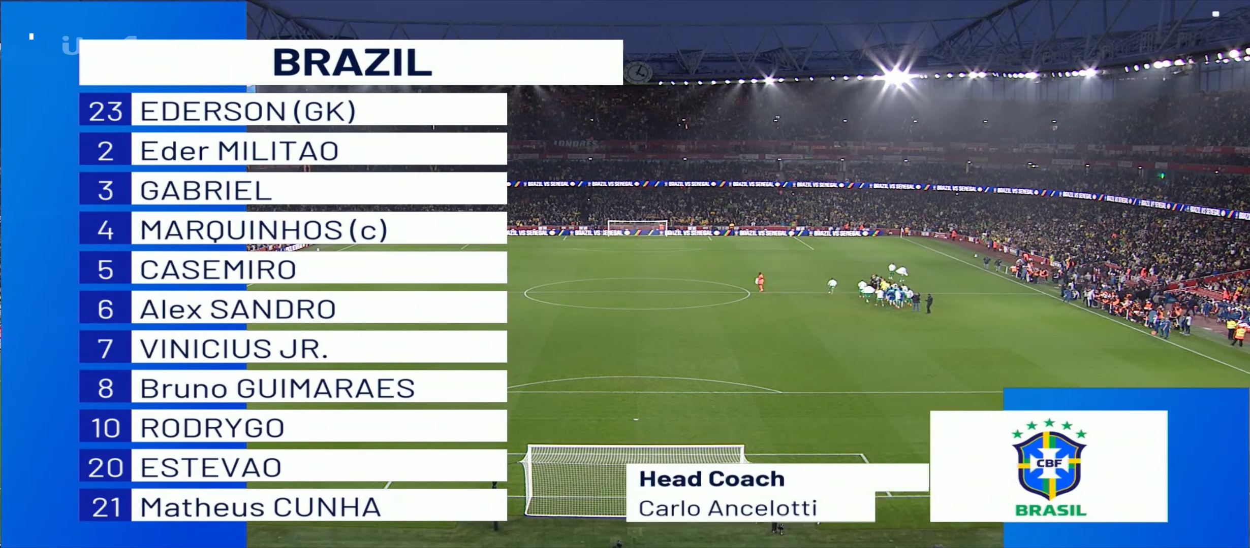 দীর্ঘদিন পরে গতকাল আবার মাঠে নেমেছিল ব্রাজিল। আন্তর্জাতিক বিরতি শুরু হয়েছে ক্লাব ফুটবল বন্ধ। ফুটবলার রা তাদের দেশের হয়ে মাঠে নেমেছে। গতকাল ব্রাজিলের একটা ফ্রেন্ডলি ম্যাচ ছিল সেনেগালের সাথে। ম্যাচটা ছিল নিরপেক্ষ ভেন্যু ইংল্যান্ডে। গতমাসের ফ্রেন্ডলি ম্যাচে জাপানের সাথে হেরে গিয়েছিল ব্রাজিল। সেখান থেকে ইম্প্রুভ করতে আরও কিছু ম্যাচ খেলা প্রয়োজন এবং সেটা অবশ্যই ভালো দলের সঙ্গে। সেনেগালের ফিফা র্যাংকিং ১৮। পাশাপাশি এই দল কয়েক বছর আগে আফ্রিকান চ্যাম্পিয়ন হয়েছে। কার্লো আনচেলওি যথারীতি তার দলকে ৪-১-২-৩ ফর্মেশনে মাঠে নামায়। তবে আশ্চর্যের বিষয় কার্লো এডার মিলিটাও কে রাইট ব্যাক হিসেবে খেলিয়েছেন। সে একজন সেন্টার ব্যাক। এবং ঐ পজিশনে মিলিটাও বেশ ভালো করেছে।