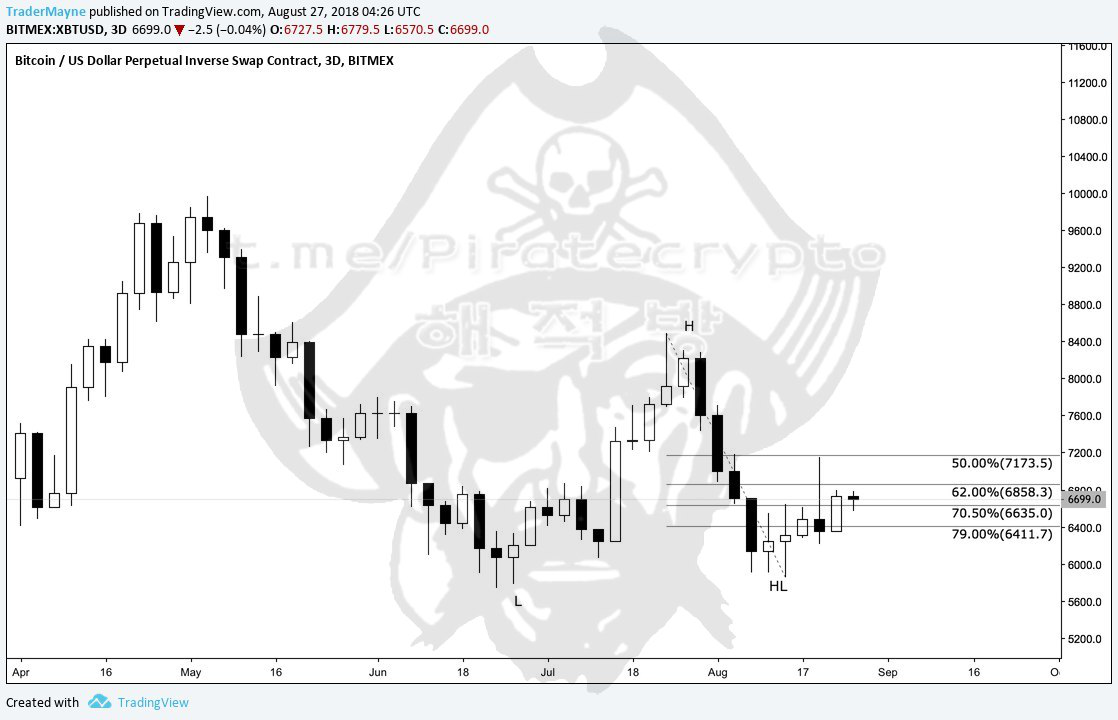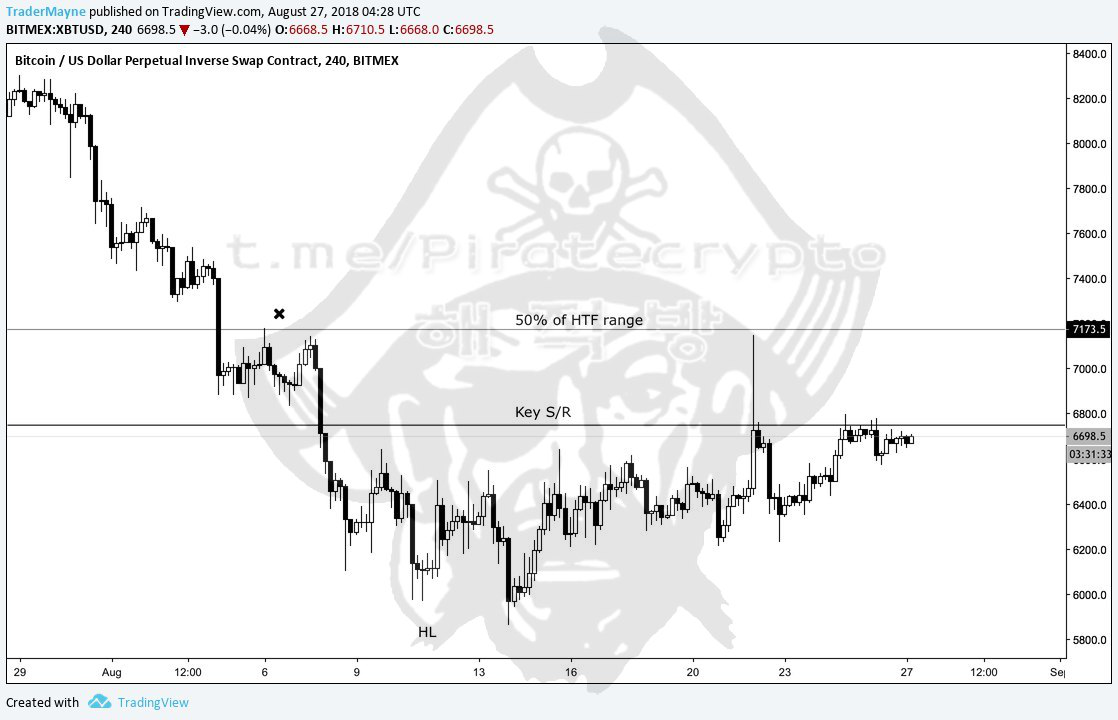 If you arent long wait for a pull back, we could pull back as low as the pivot from my last post, but I think anything around 6500-6600 would be a safe play R/R wise. A lot of big cap alts looking primed for moves as well. The first reasonable target would be the 50% of the HT range at about 7.1k, lining up nicely with the stops up there. I would be taking profits for longs up there and potentially hedging short. If we cleanly break 6800 we should see 7.1k met rather quickly