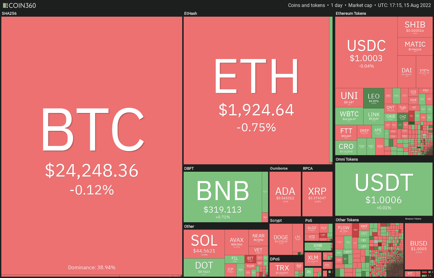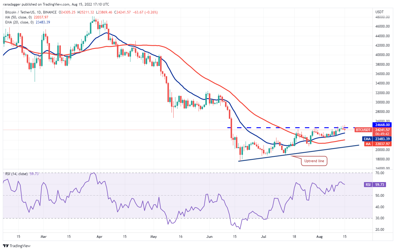 The bulls tried to resume the up-move in Bitcoin but the bears sold aggressively at $25,211 and pulled the price down to the 20-day exponential moving average (EMA) ($23,483). This resulted in the formation of an outside-day candlestick pattern on Aug. 15.