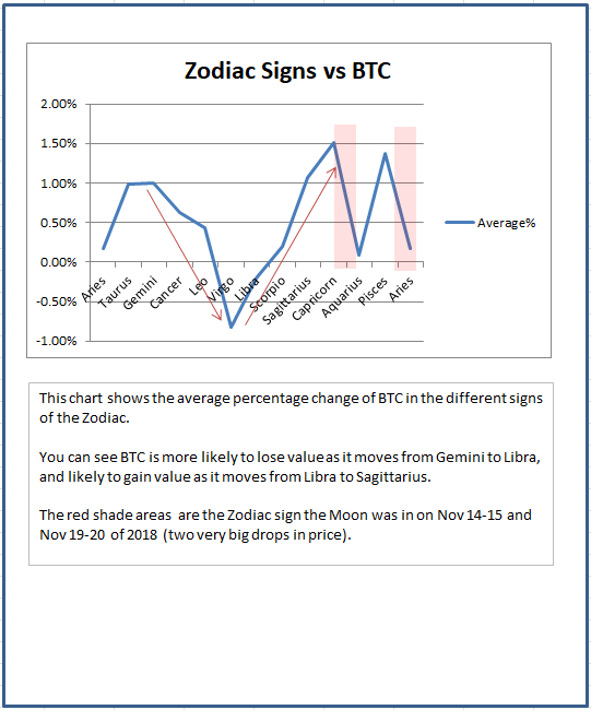 Bitcoin appears to follow a cycle composed of what zodiac sign the Moon is in.