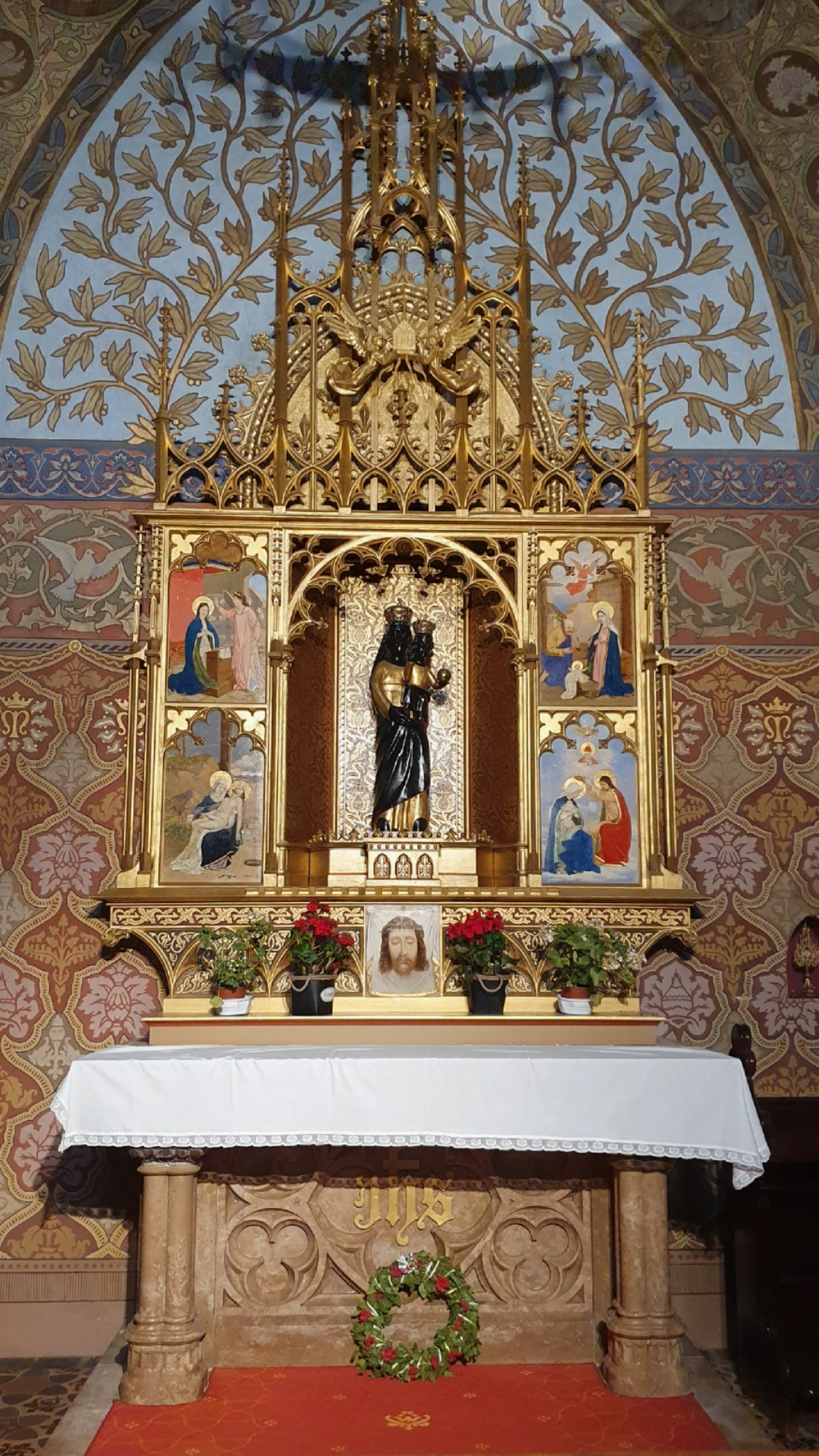 1541년 부터 성당은 145년간 오스만 제국의 지배를 받으며 모스크로 사용되었다. 그러다 1686년 신성 동맹국이 부다시를 둘러싸고 대포 공격을 하던 중 교회의 벽이 무너졌는데, 거기서 잊혀졌던 성모상이 나타났다. 모스크에서 기도 중이던 터키인 앞에 나타난 성모상 덕에 이슬람 수비대의 사기는 저하되고 도시가 함락됨으로 오스만 제국의 지배가 종결되었다.