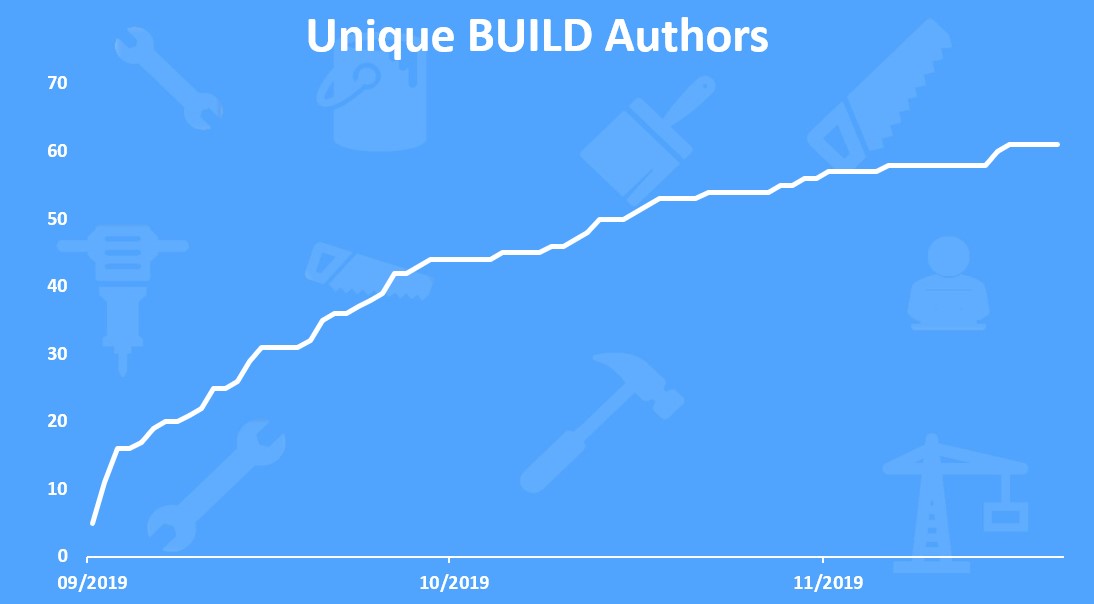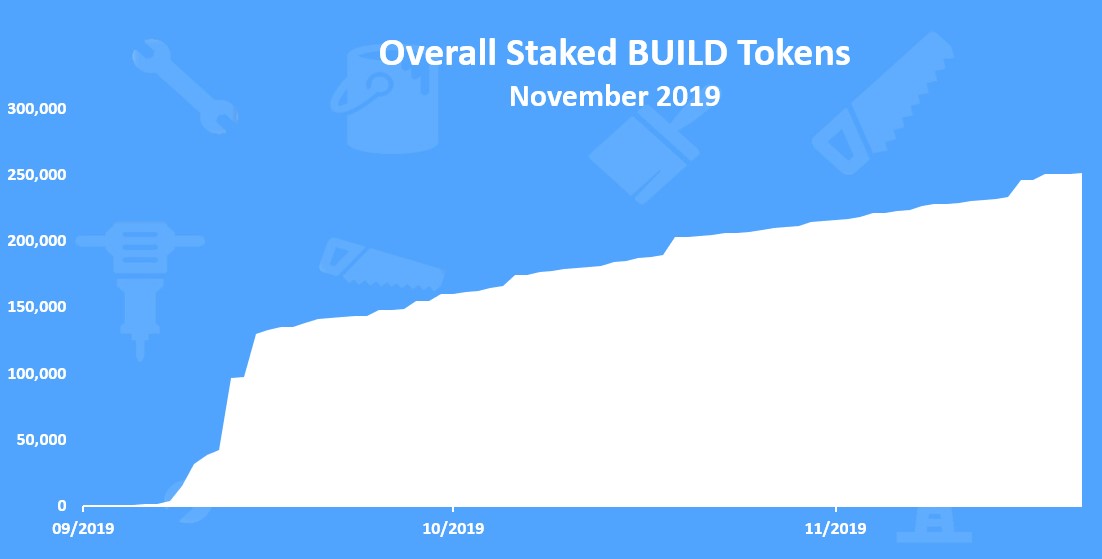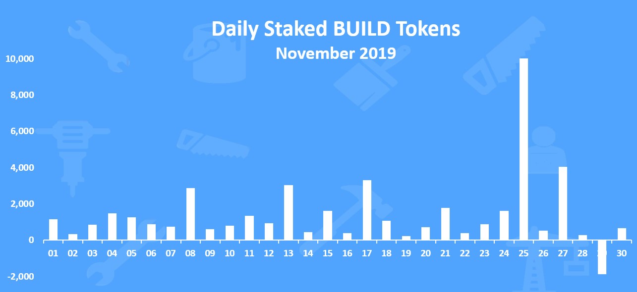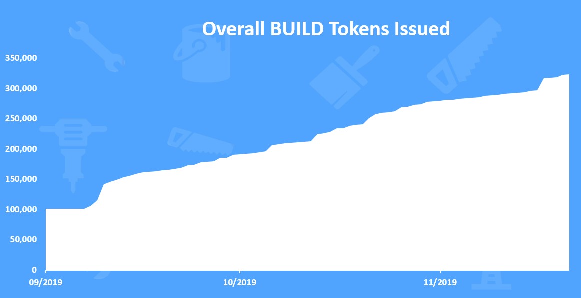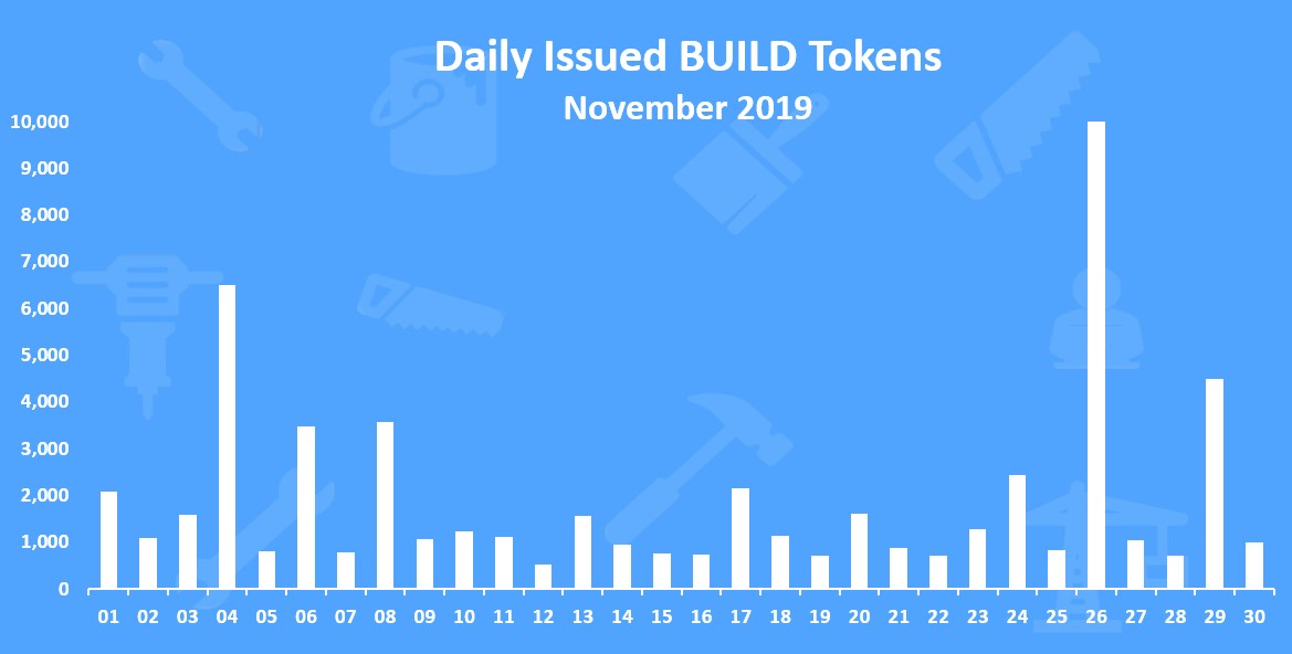 On average there is around 2000 BUILD tokens issued daily. In November 2019 the total amount of issued BUILD tokens is 66,158 tokens.