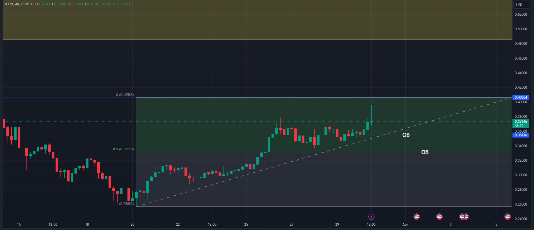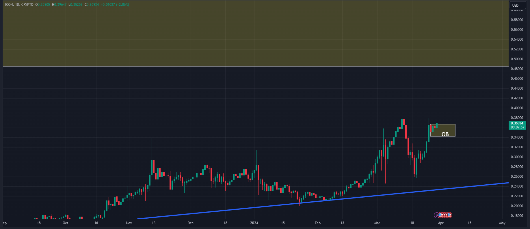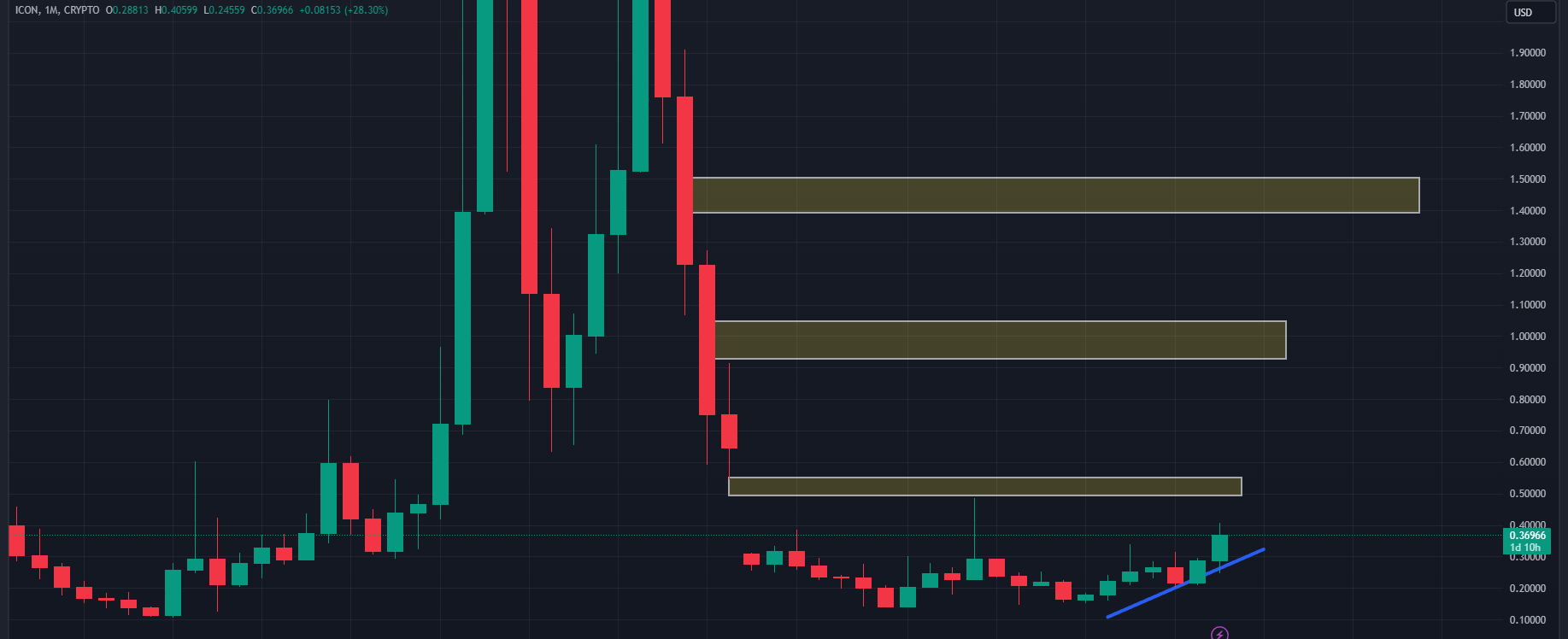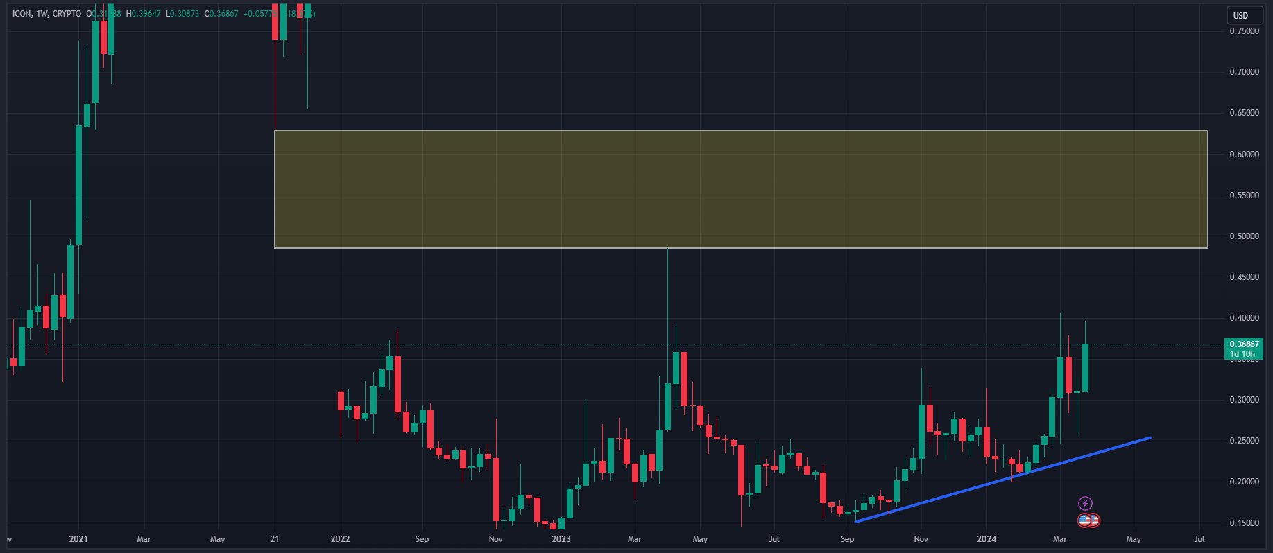 Observing ICX's chart on a monthly basis, it appears to be in a bullish trend. Looking at the weekly chart, trading is currently occurring around $0.3687, with no significant liquidity downside but creating sell-side liquidity at $0.47. However, there's a substantial gap between $0.48 and $0.64, which I anticipate will be filled in the near future.