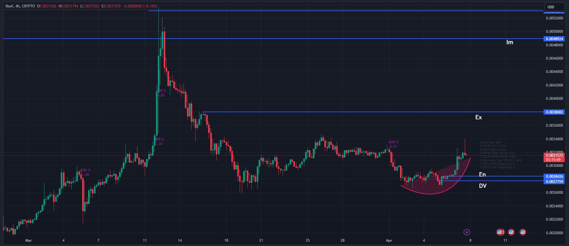 Analyzing the daily chart, Reef is currently trading at $0.44, engaging in regular trading within a range for quite some time. It's likely to swing up to $0.69 in the future.