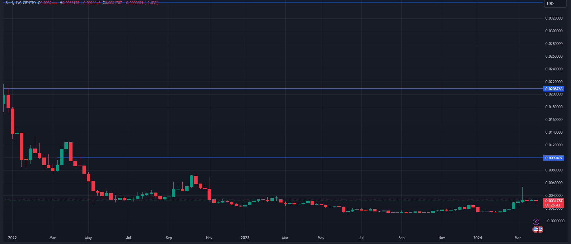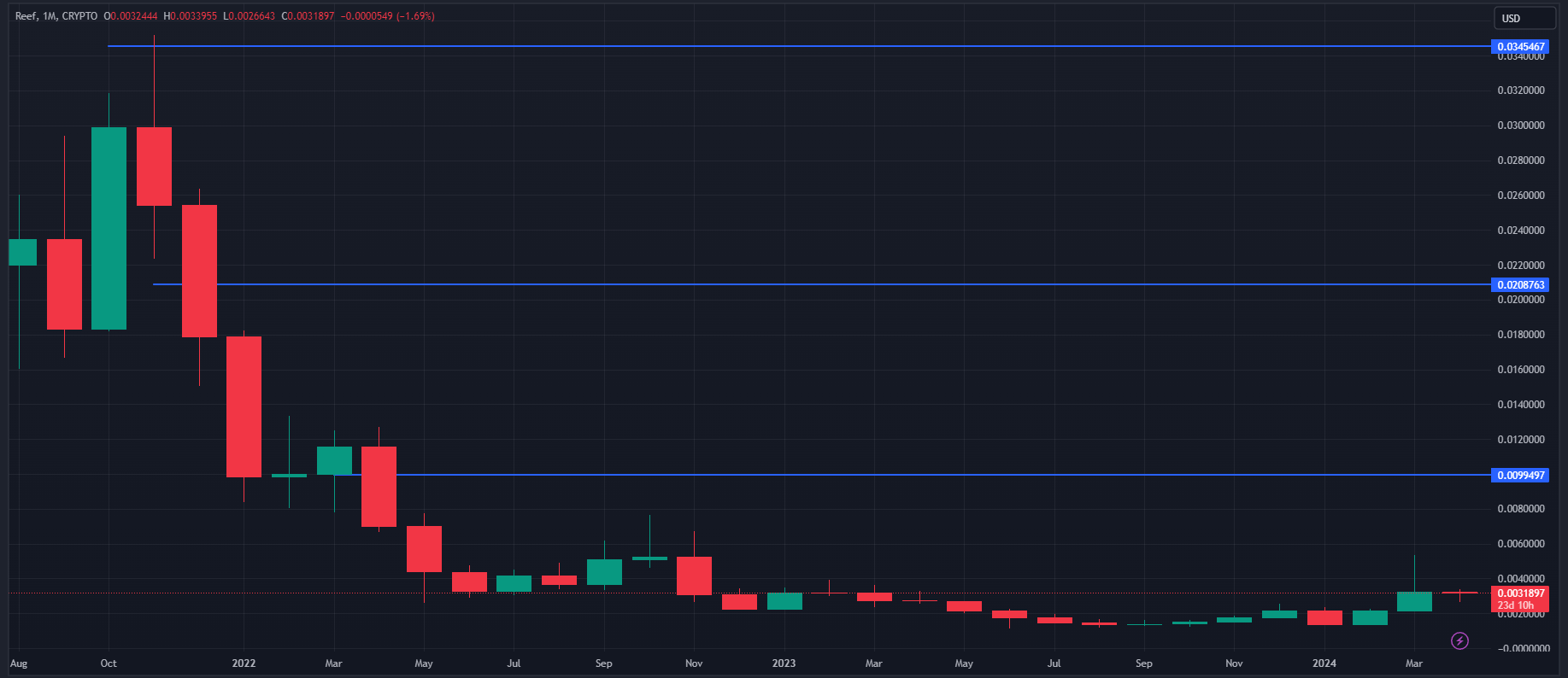 Upon observing the monthly chart, Reef's current situation doesn't seem very promising. It's down nearly 90% from its all-time high, despite showing a positive trend in recent months. Additionally, their recent tweet suggests that their app is already in the testing phase, indicating progress aligned with their roadmap. Considering this, I anticipate significant returns from here.