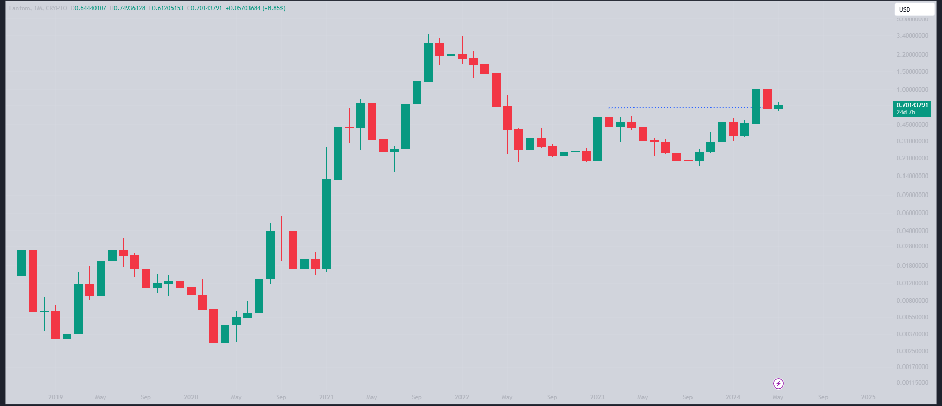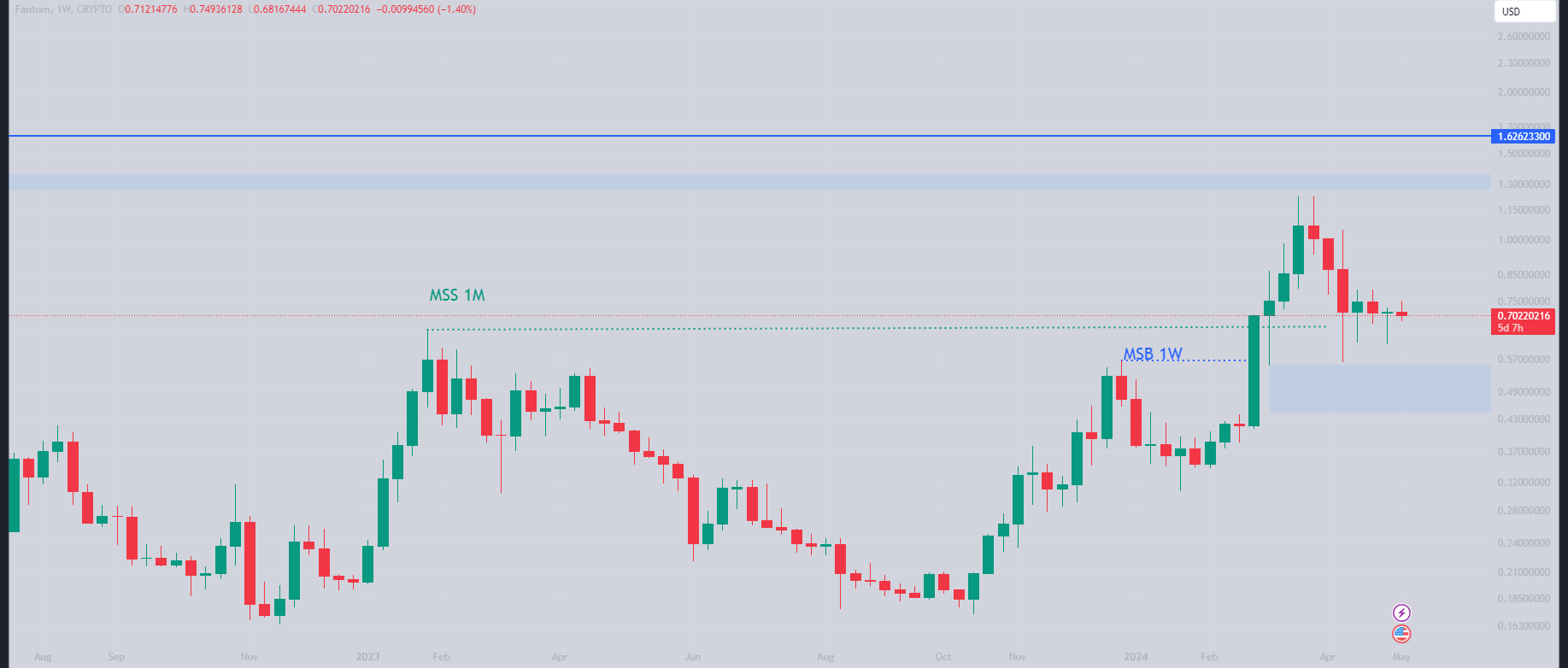 Looking at the monthly chart, Fantom appears bullish. The price has potentially undergone a market structure shift, breaking above the $0.65 level. Currently, the price seems to be consolidating. While a minor correction to around $0.46 is a possibility, a future breakout towards $1.62 might also be on the horizon.