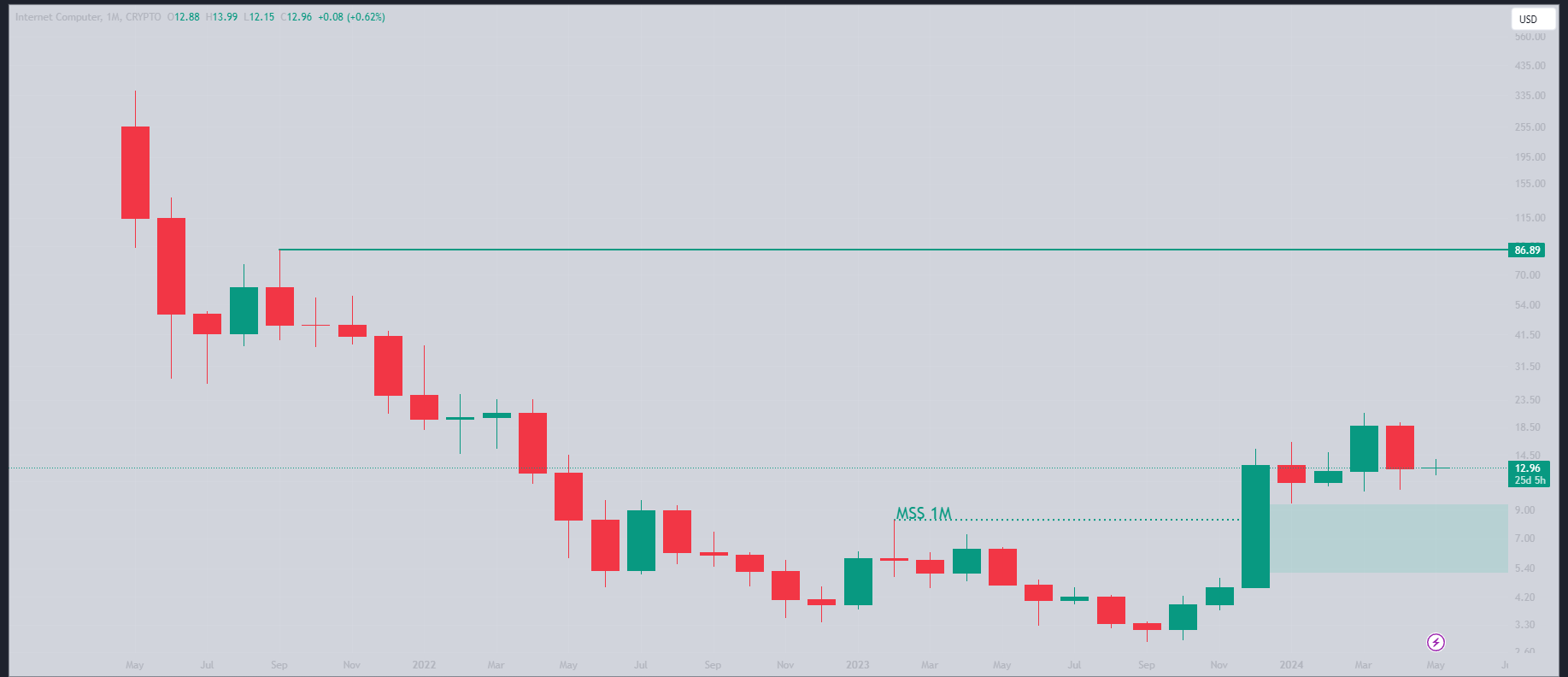 The monthly price chart for ICP suggests a confirmed market structure shift at the $8.26 level. Currently, the price is trading above this level and establishing a baseline between $9.56 and $15.