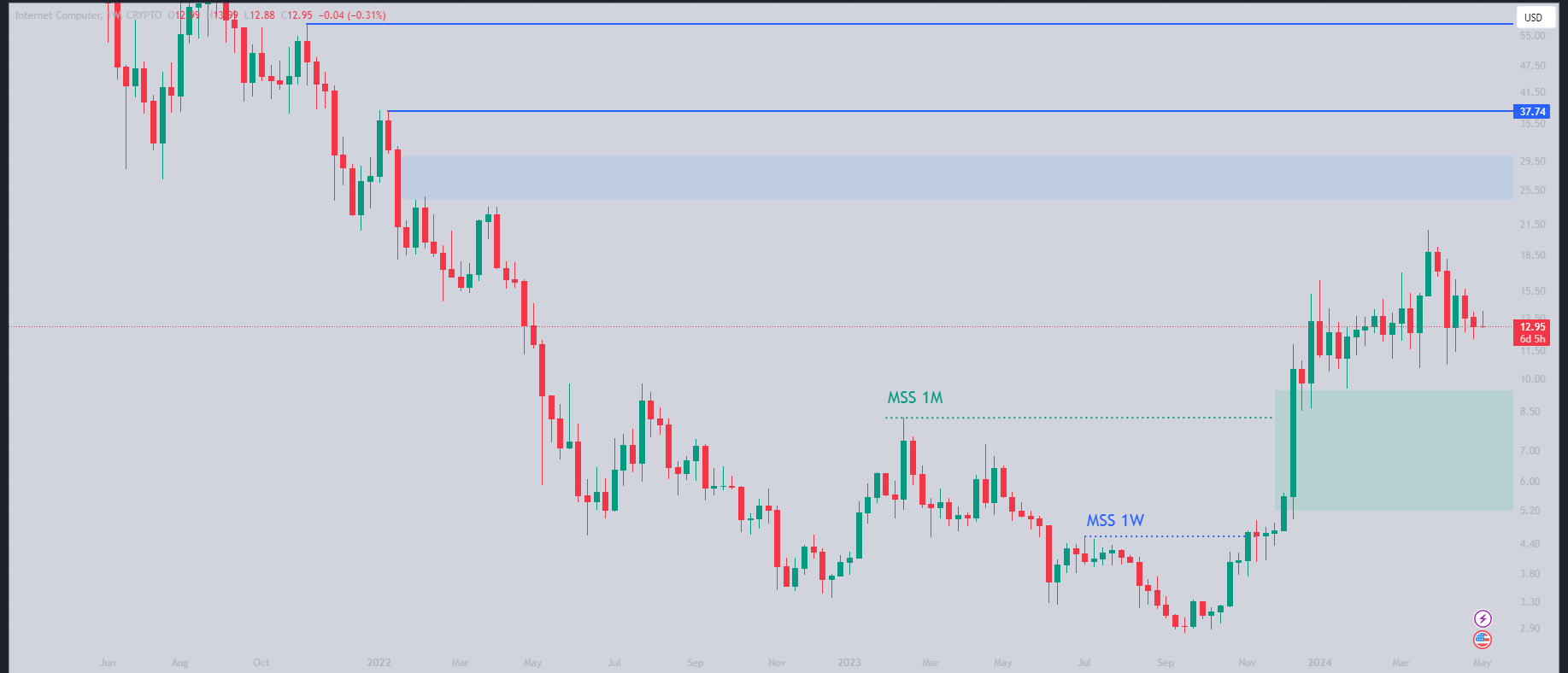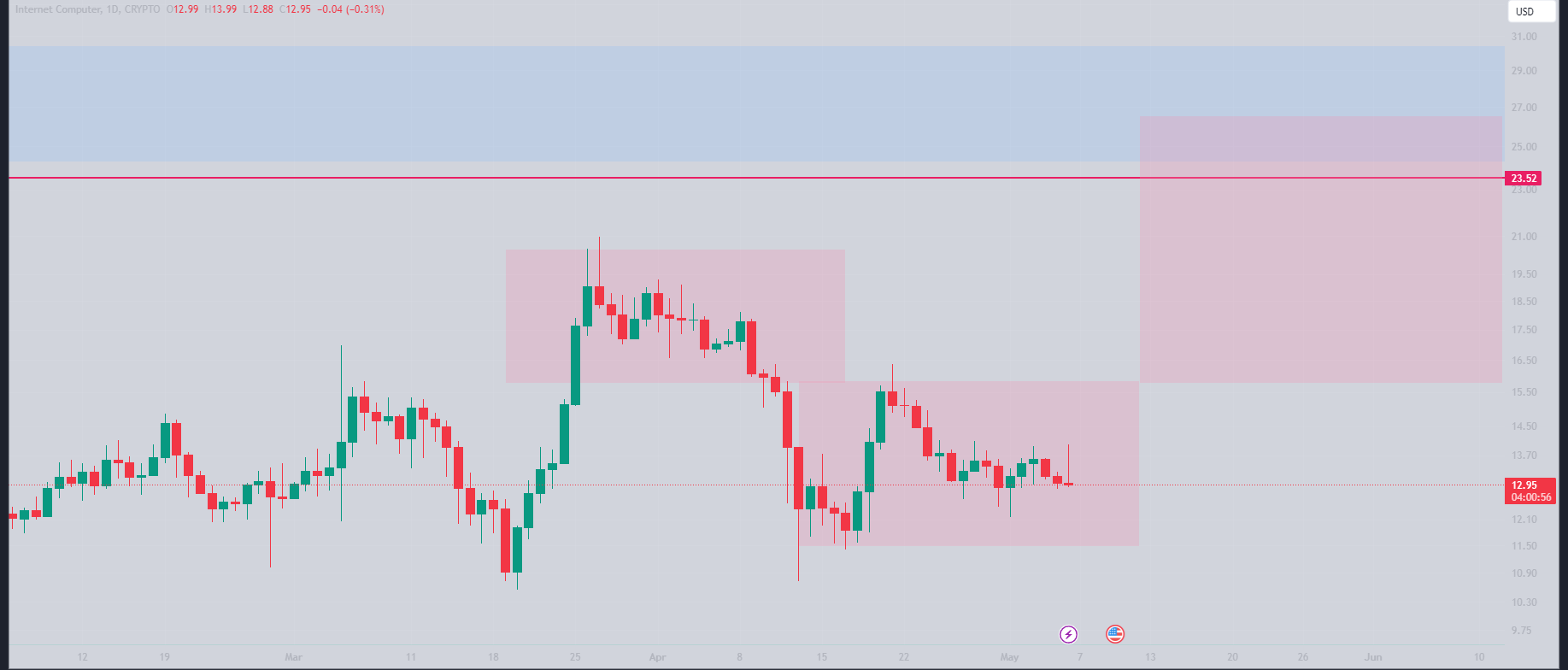 The weekly chart indicates that ICP has been trading within a range for the past few weeks, with a range high of $15.6 and a range low of $12.