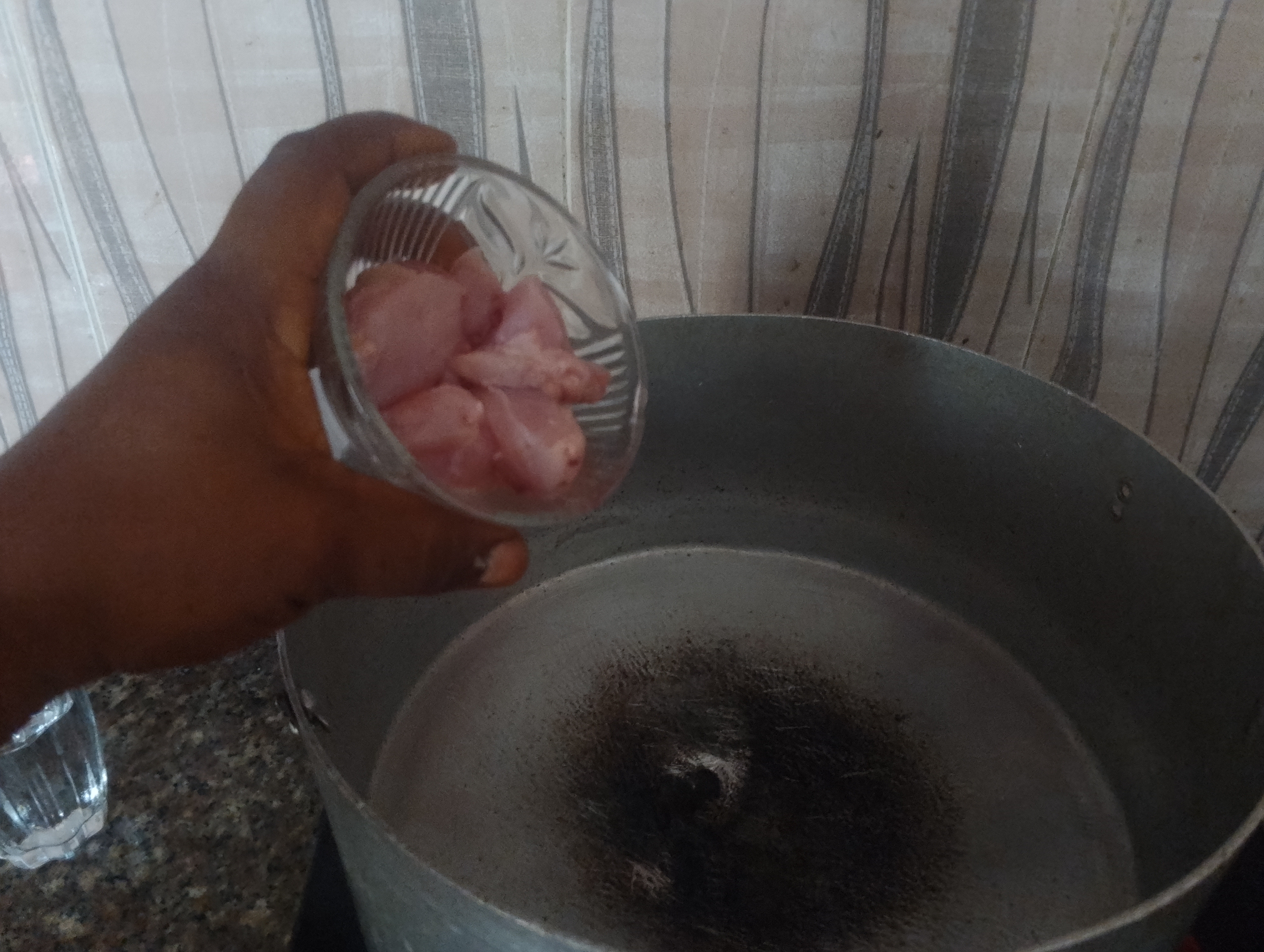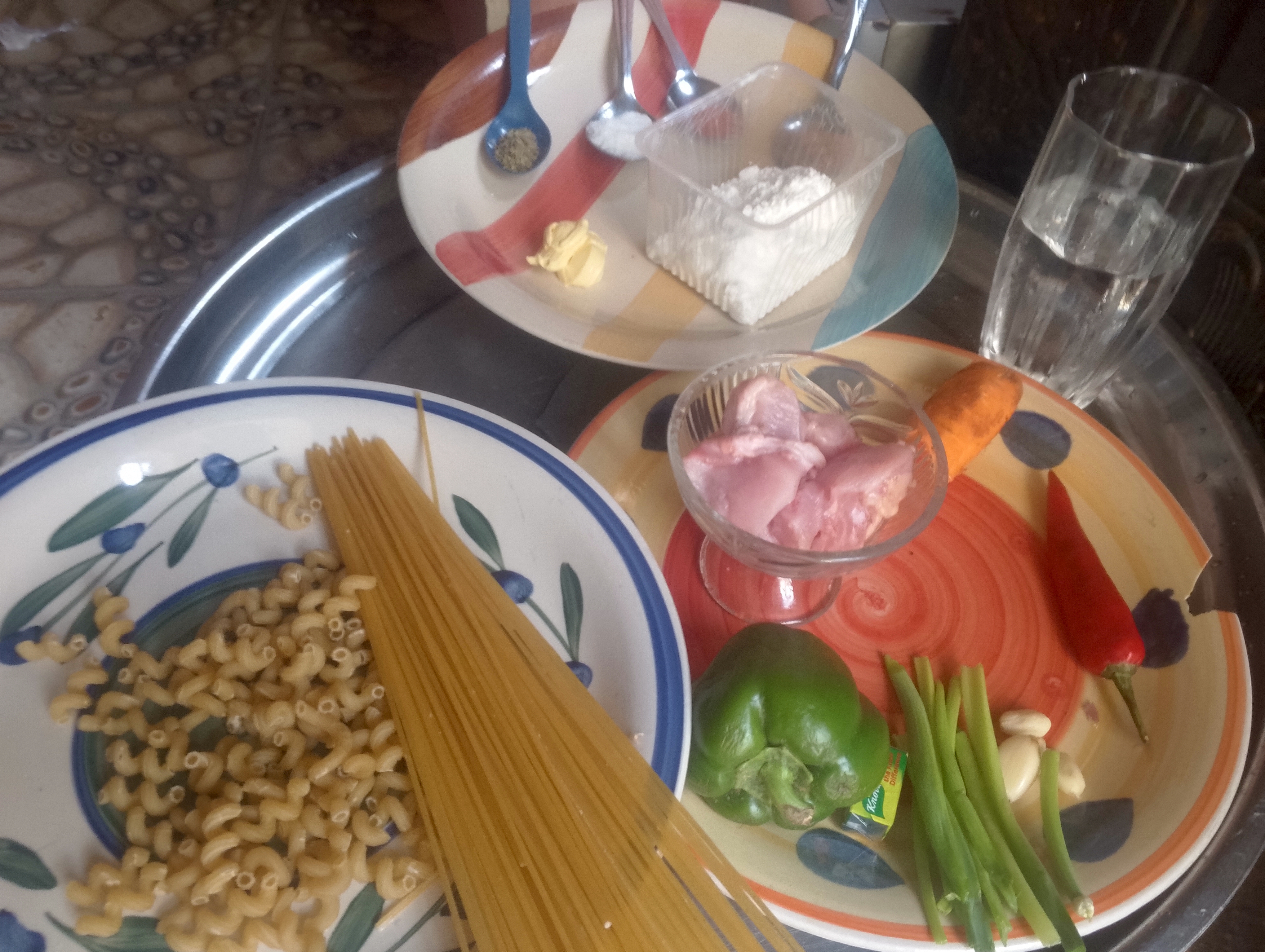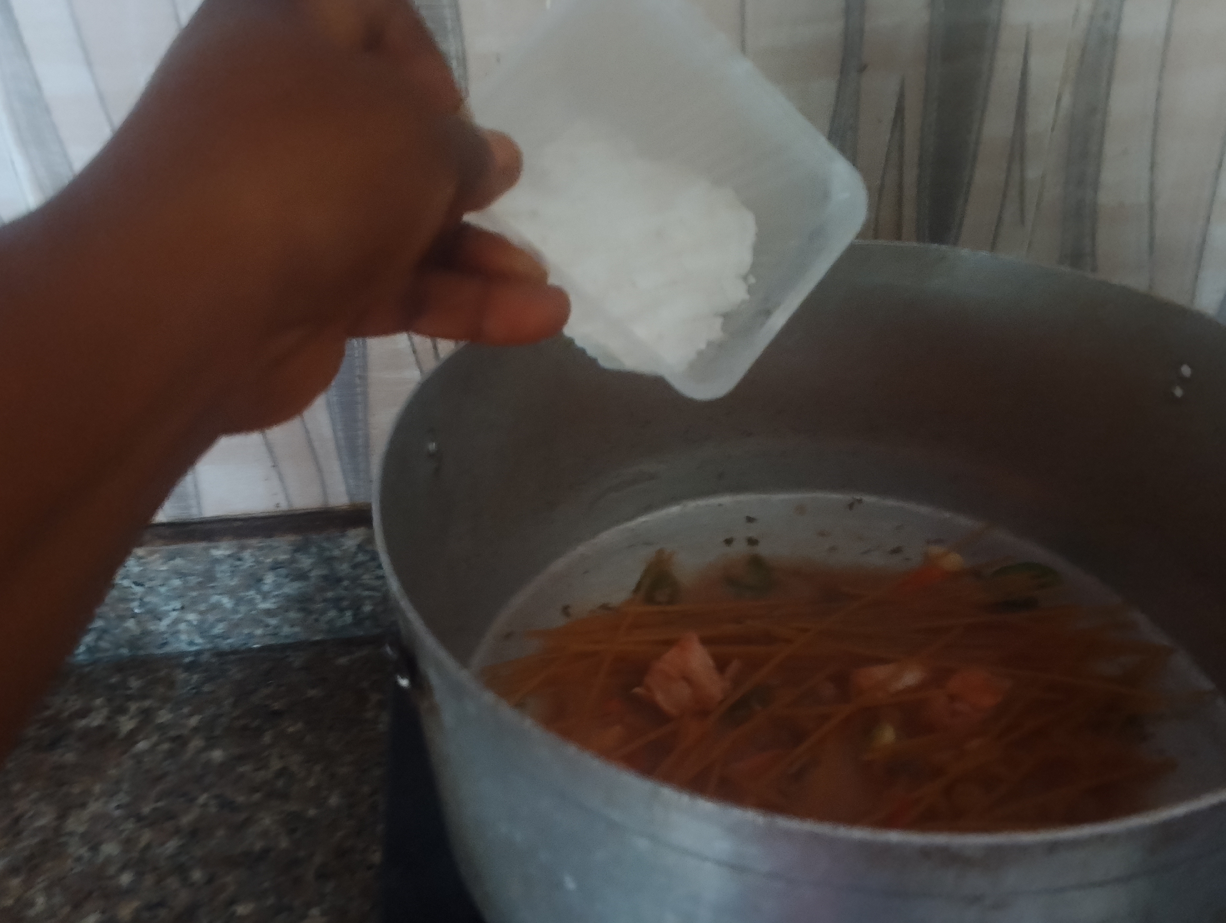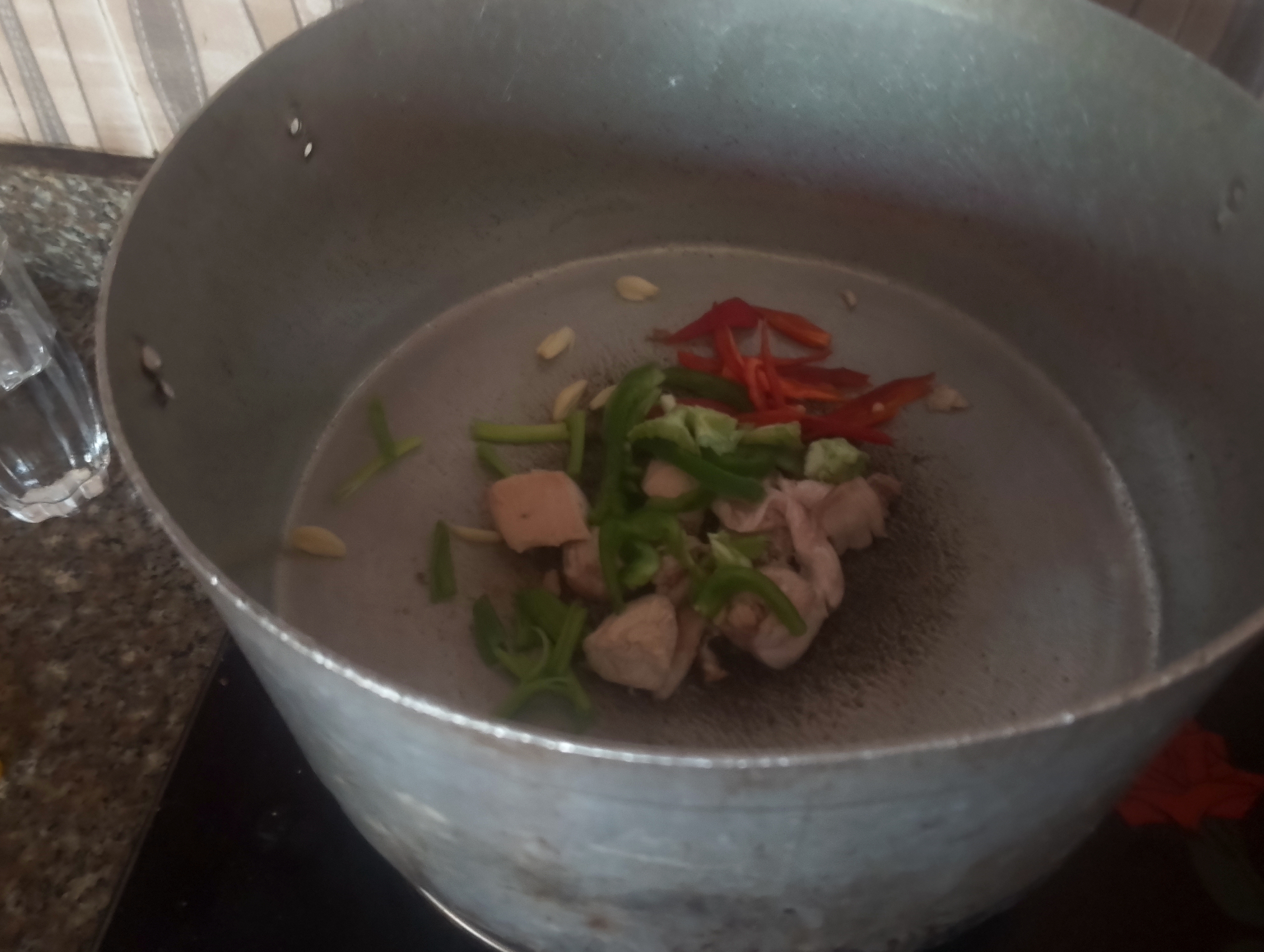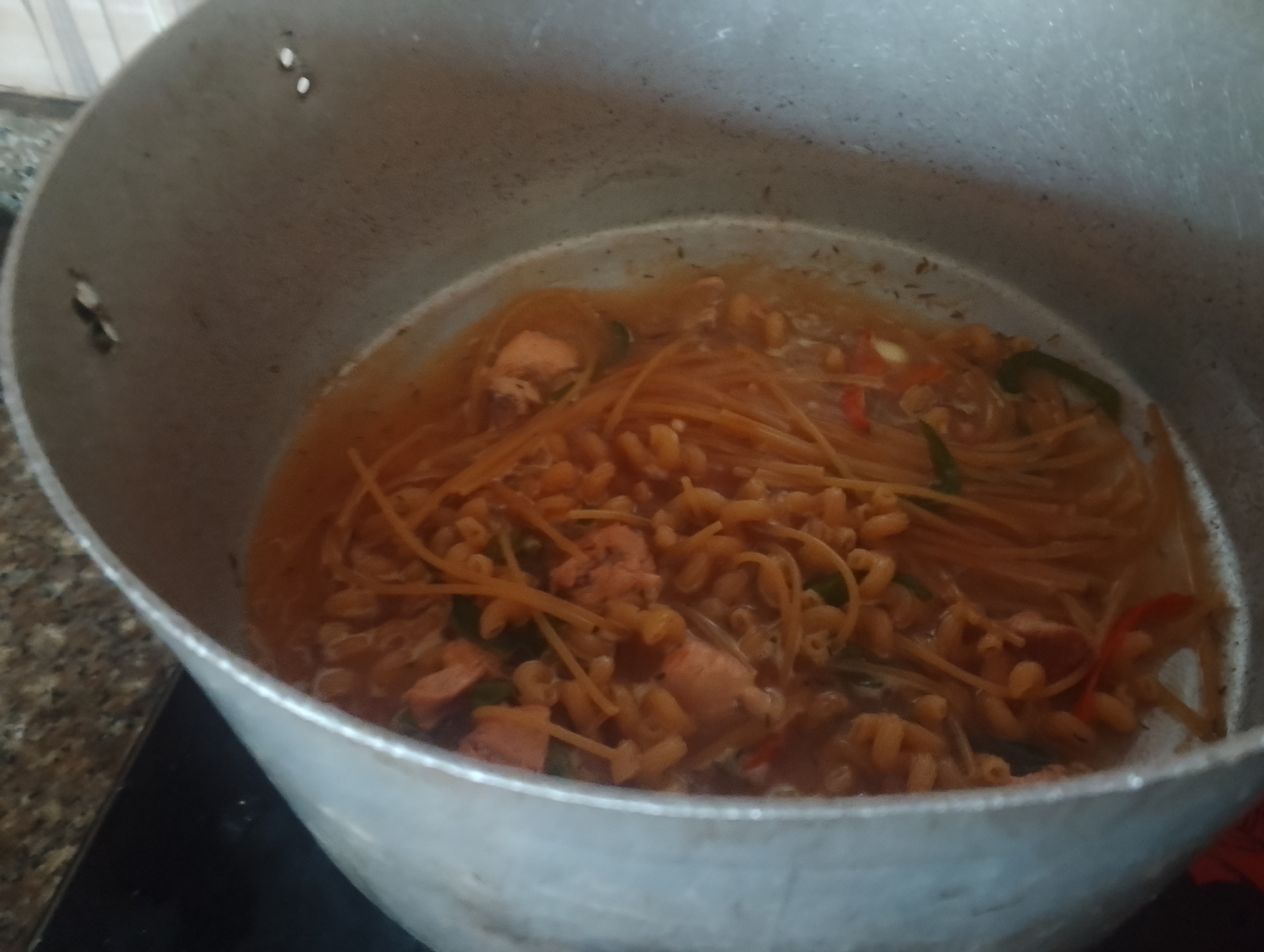 I added a glass of water and when it boiled I washed my pasta and macaroni added with my cooking pot I waited for 30 minutes for boiling/ cooking the veggies well, then chicken and pastas.