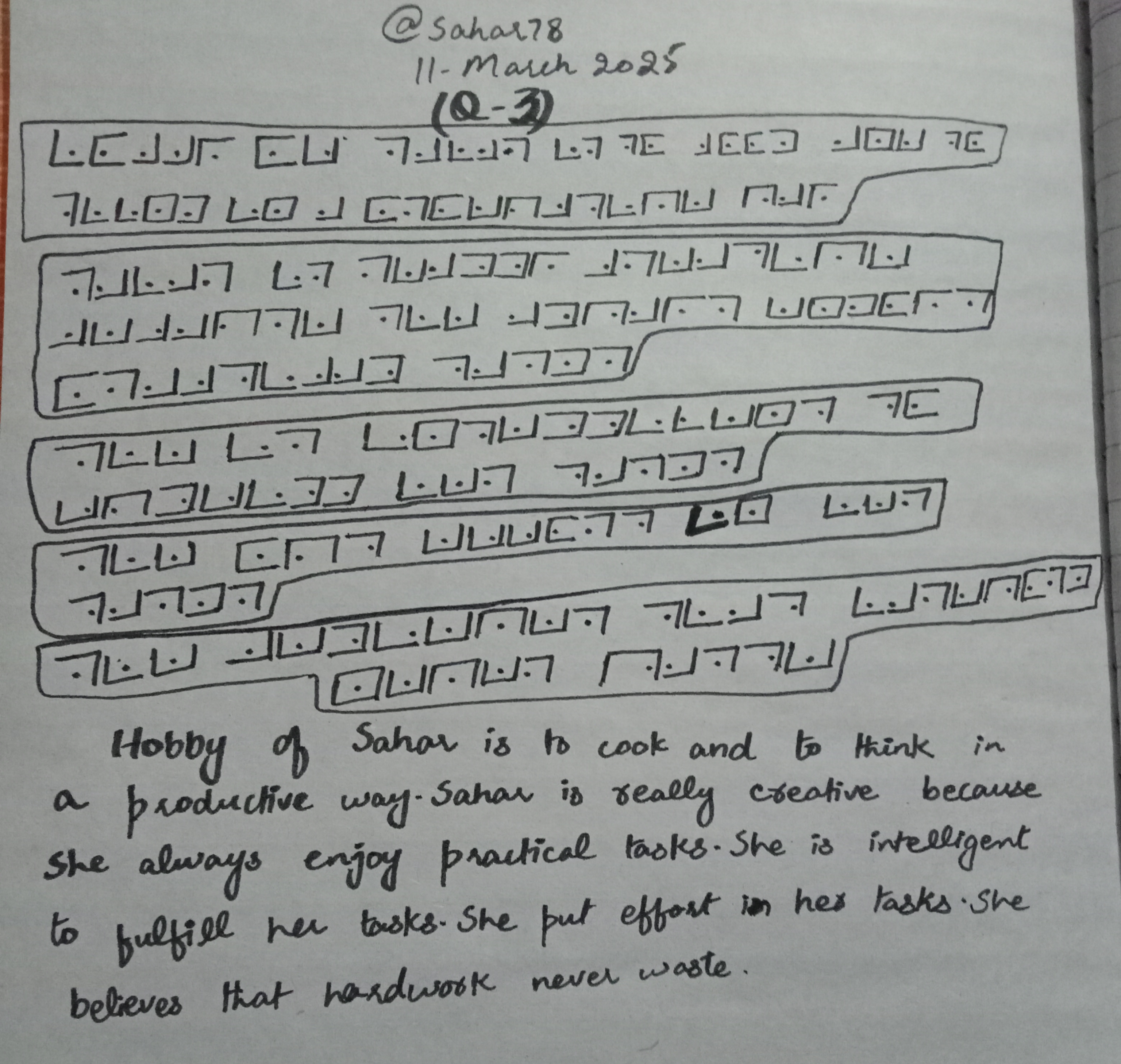 HOBBY OF SAHAR IS TO COOK AND TO THINK IN A PRODUCTIVE WAY.SAHAR IS REALLY CREATIVE BECAUSE SHE ALWAYS ENJOY PRACTICAL TASKS.SHE IS INTELLIGENT TO FULFILL HER TASKS.SHE PUT EFFORT IN HER TASKS.SHE BELIEVES THAT HARDWORK NEVER WASTE.