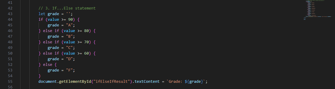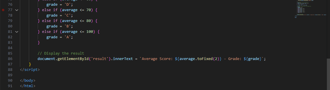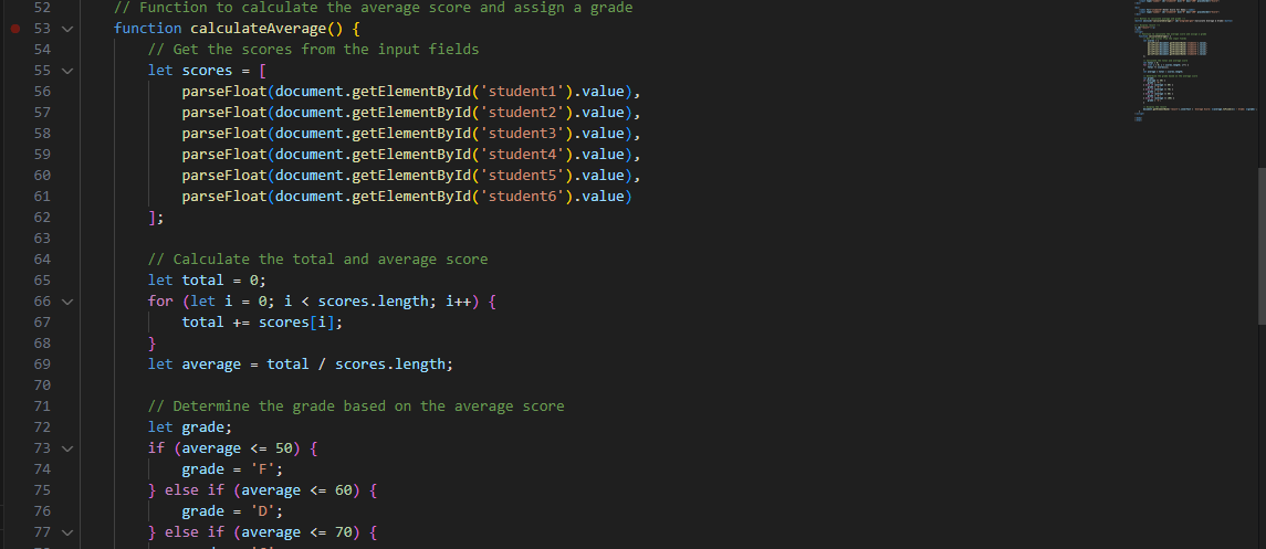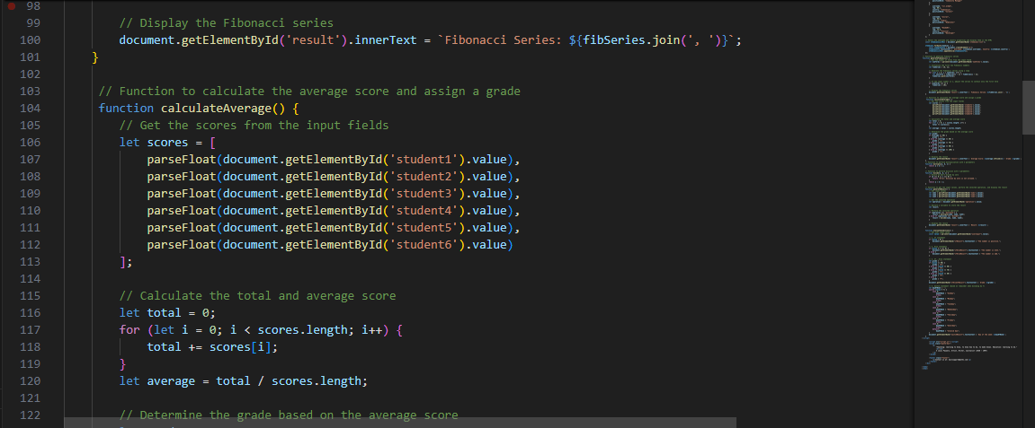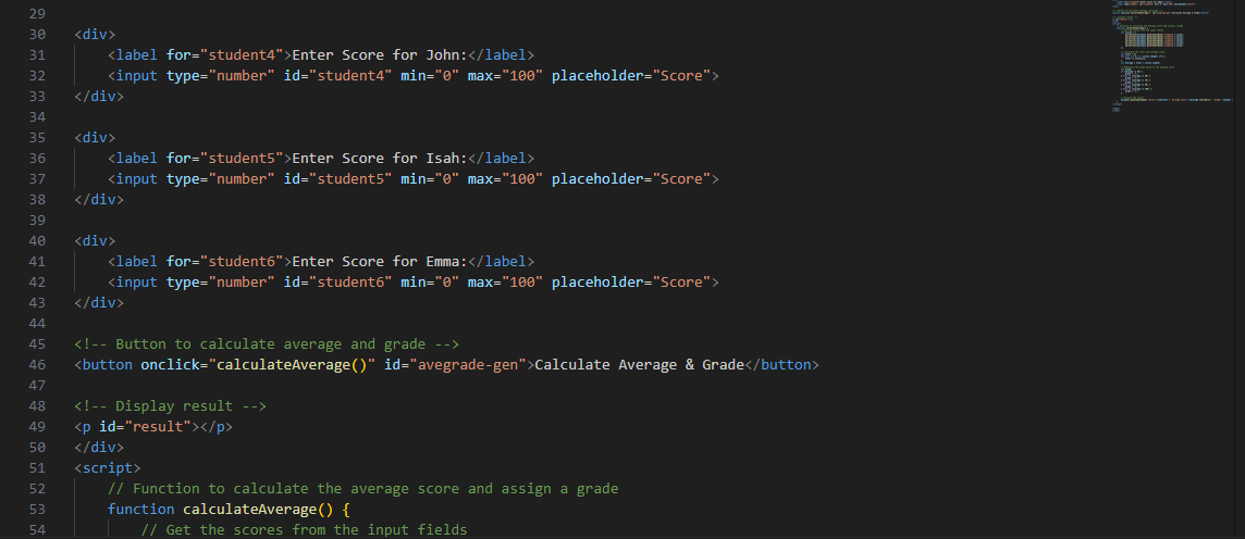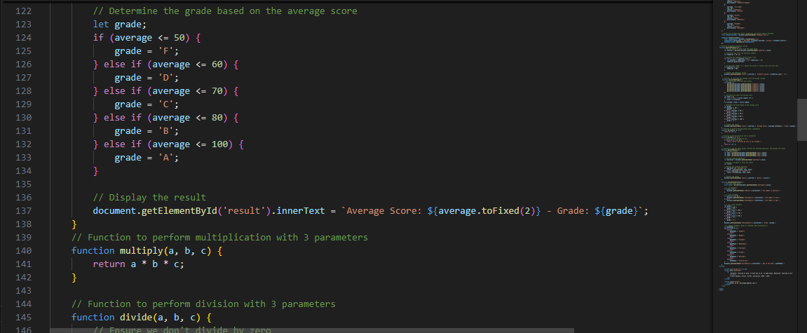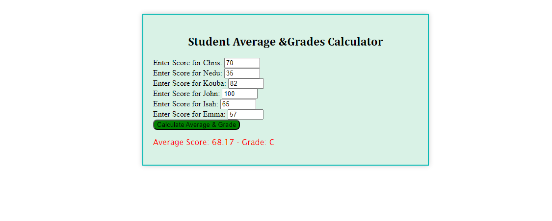 When the function retrieves the score entered in the various input fields, it then sums up the score and then calculates the average. After that is done, the function also uses the if and the else if condition to calculate the grade based on the criteria which has been given to it earlier.