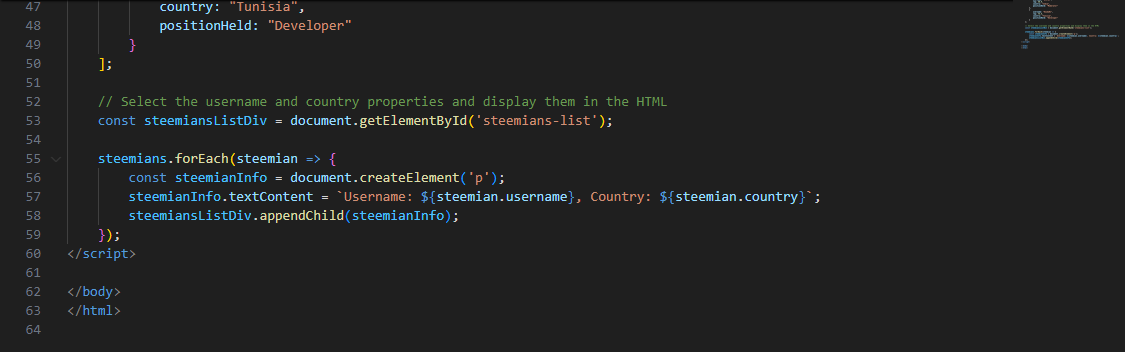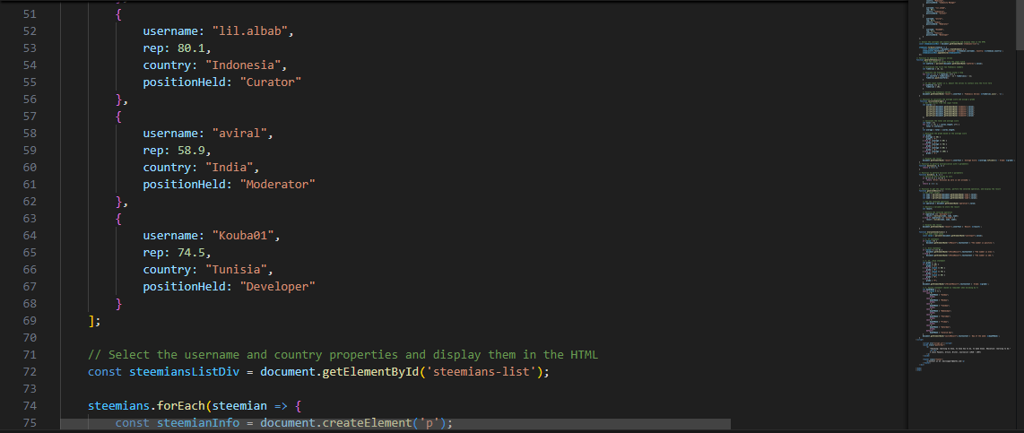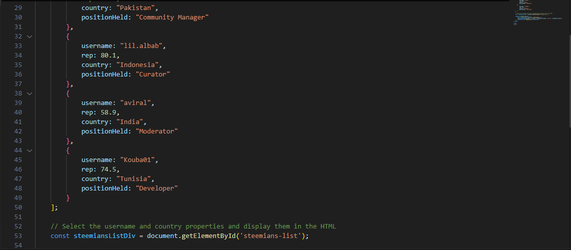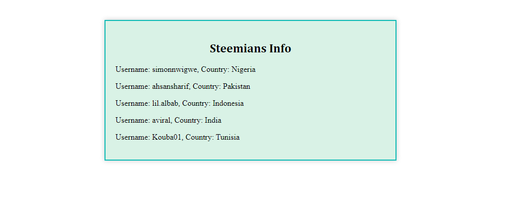 Since our focus here is the username and countries of the Steemians, we must use the forEach loop function and then go to the created array and fetch just what is needed.