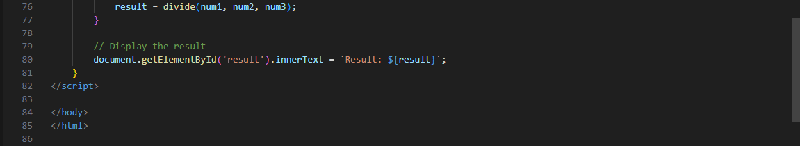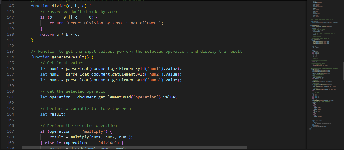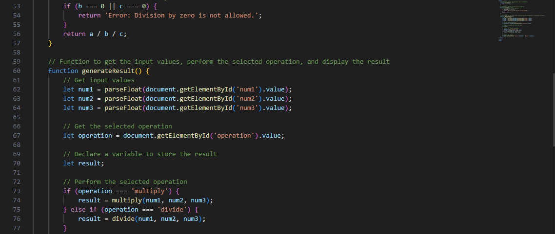 The function multiply(a, b, c) is used to multiply the 3 parameters that the user has entered. This means that a user must enter the 3 input fields before the function will work. If any of the fields is not entered then an error message will come up.