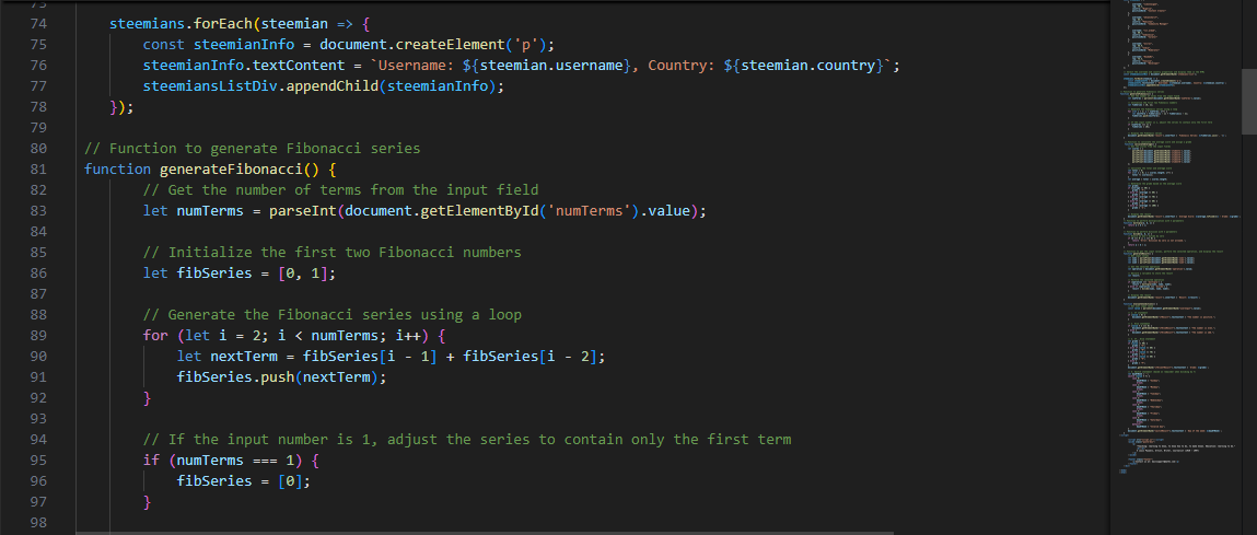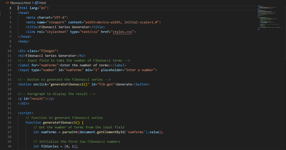 The work of the for loop here is to generate the remaining Fibonacci numbers by summing up the last two numbers in the sequence to give you the next Fibonacci number. I have created an HTML5 document here that shows the Fibonacci Series Generator.