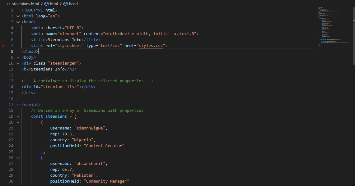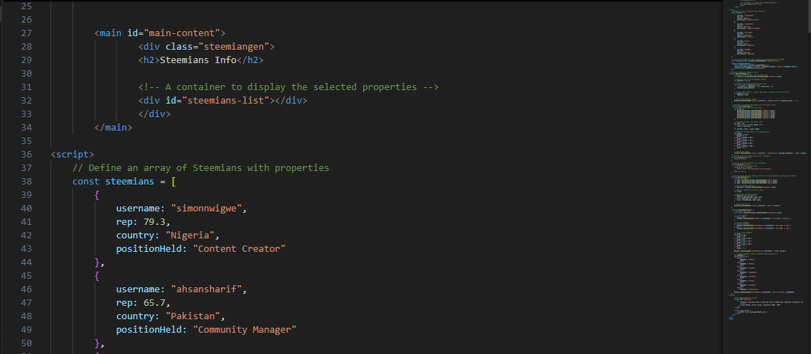Here, we have the details of Steemians which include their username, reputation, country, and position held on Steemit. Now all of these details are seen as an object. So these objects are also stored in an array called Steemians.