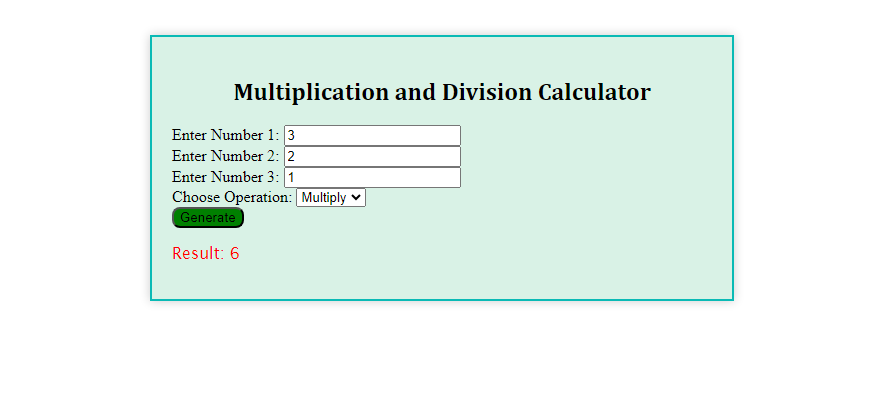 From the above question, a function that accepts 3 parameters will solve division and multiplication problems is what we are going to be looking at here. To make this possible I decided to have my 3 input fields where the numbers can be entered.
