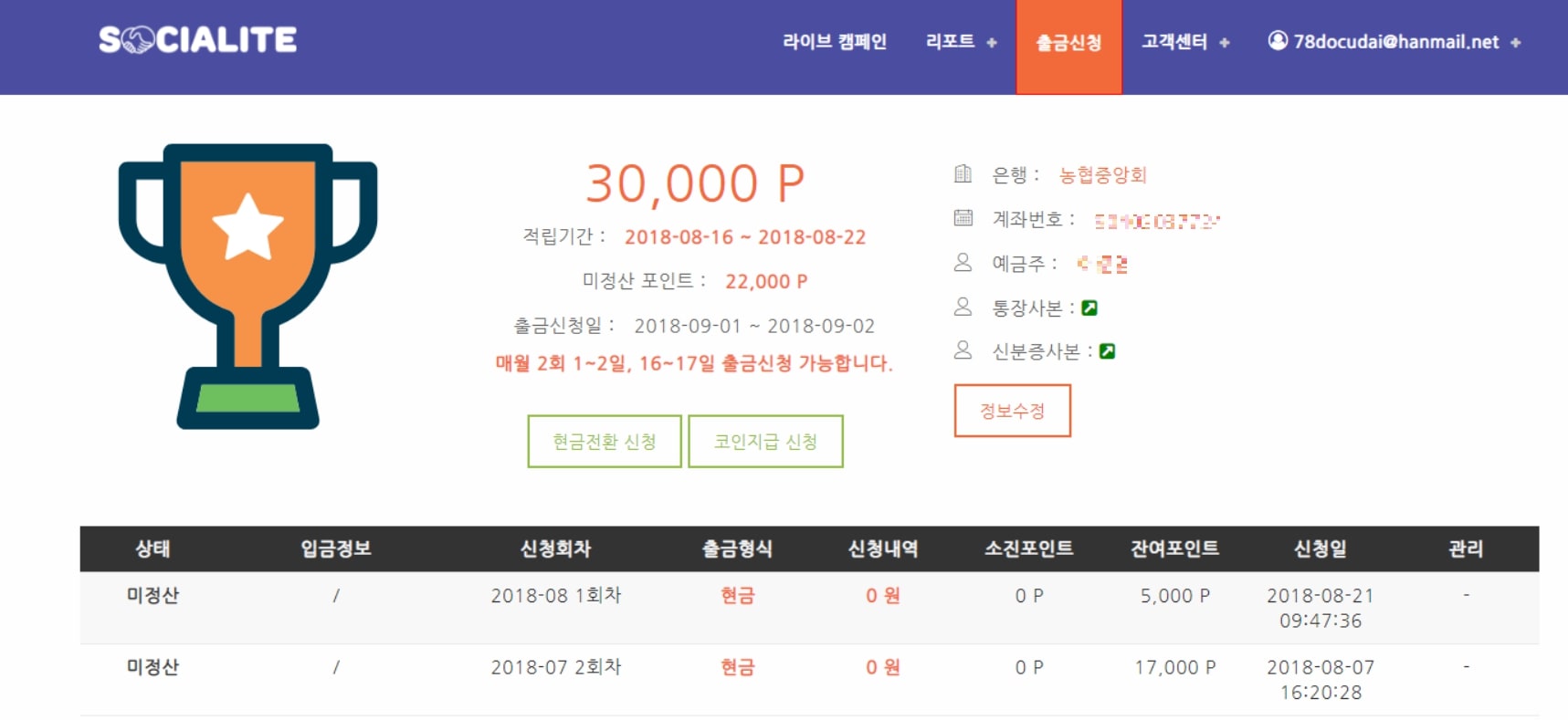 상기의 캠페인 참여로 획득한 포인트는 출금란에서 확인이 가능하고 한달에 2회 현금 출금 또는 루키코인으로 전환이 가능합니다.
