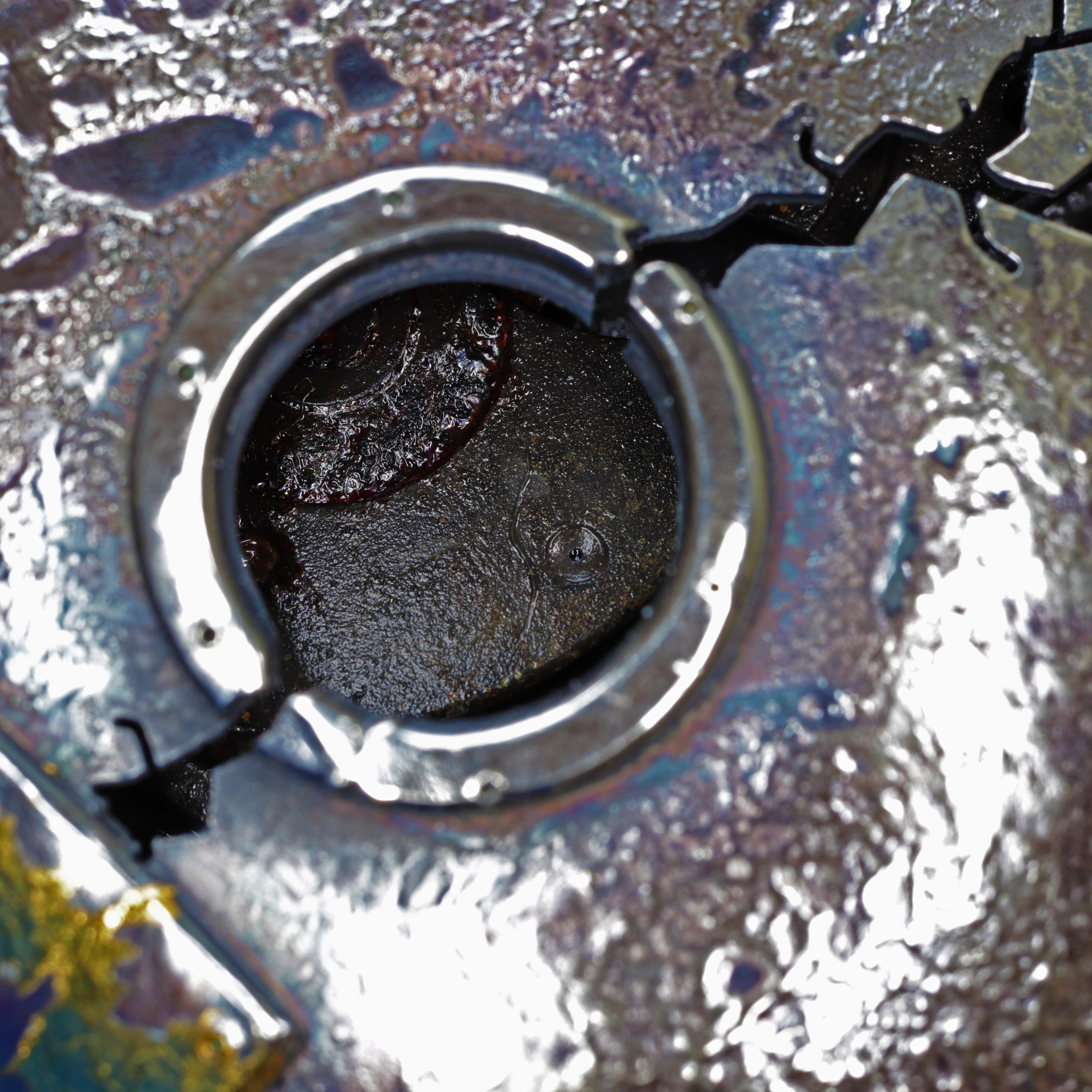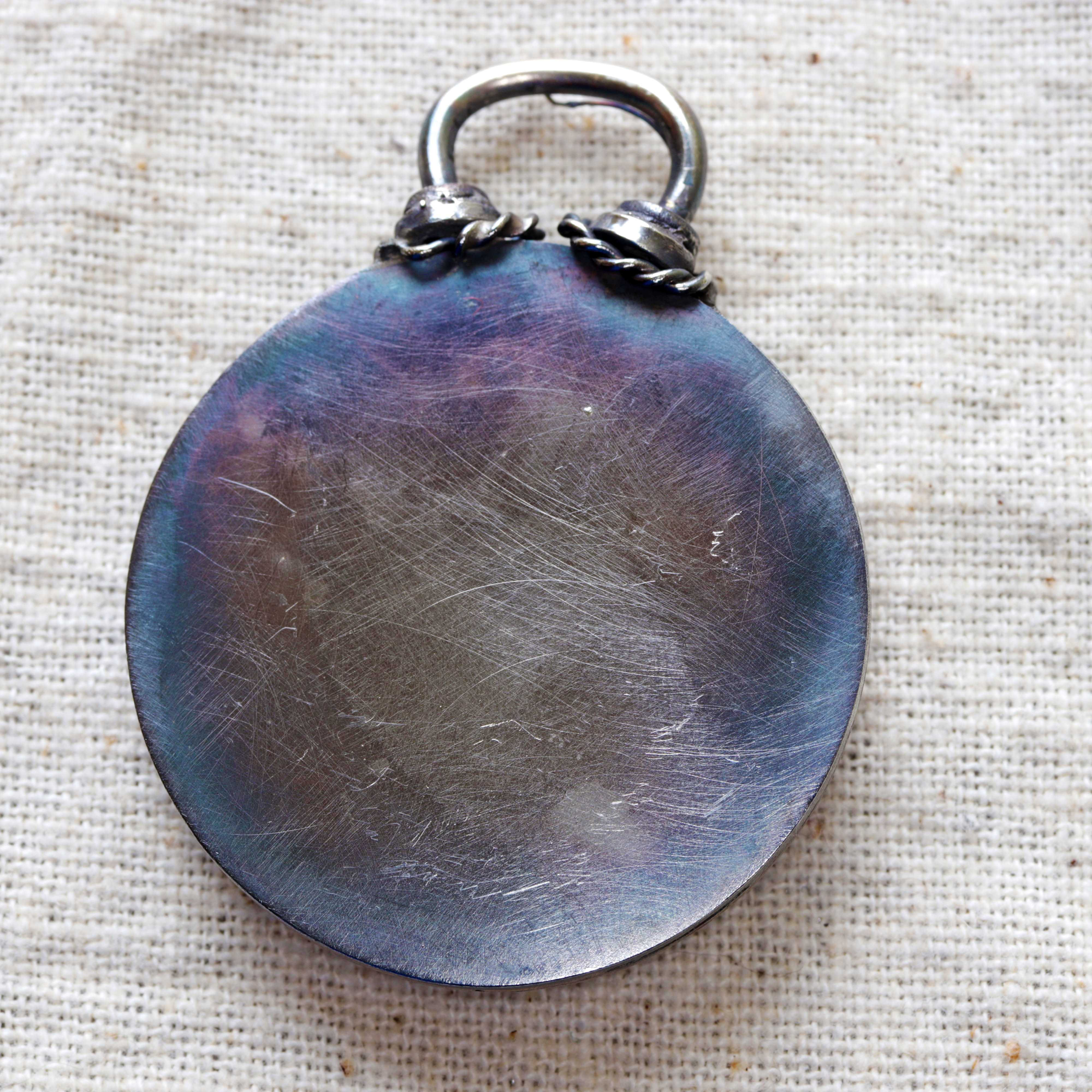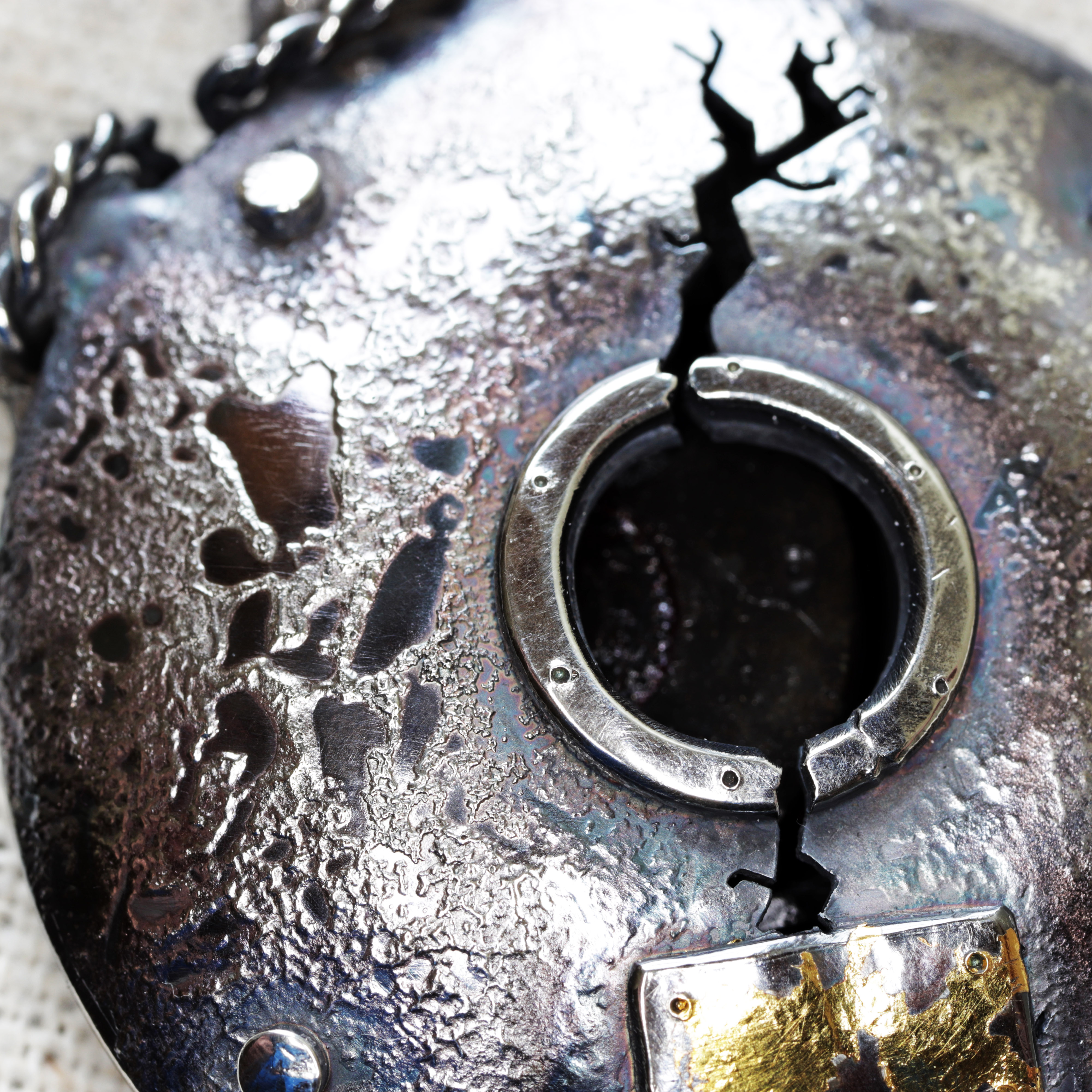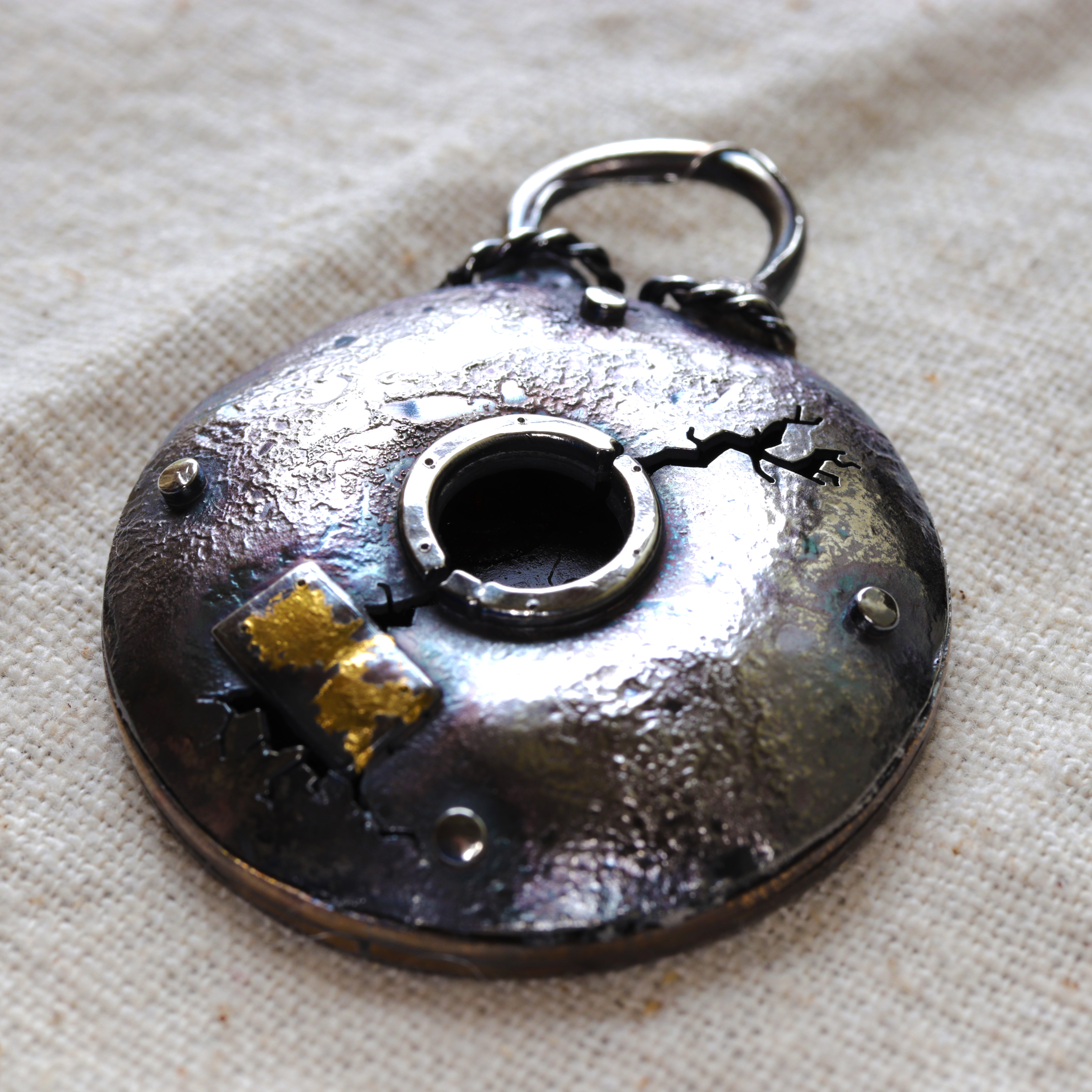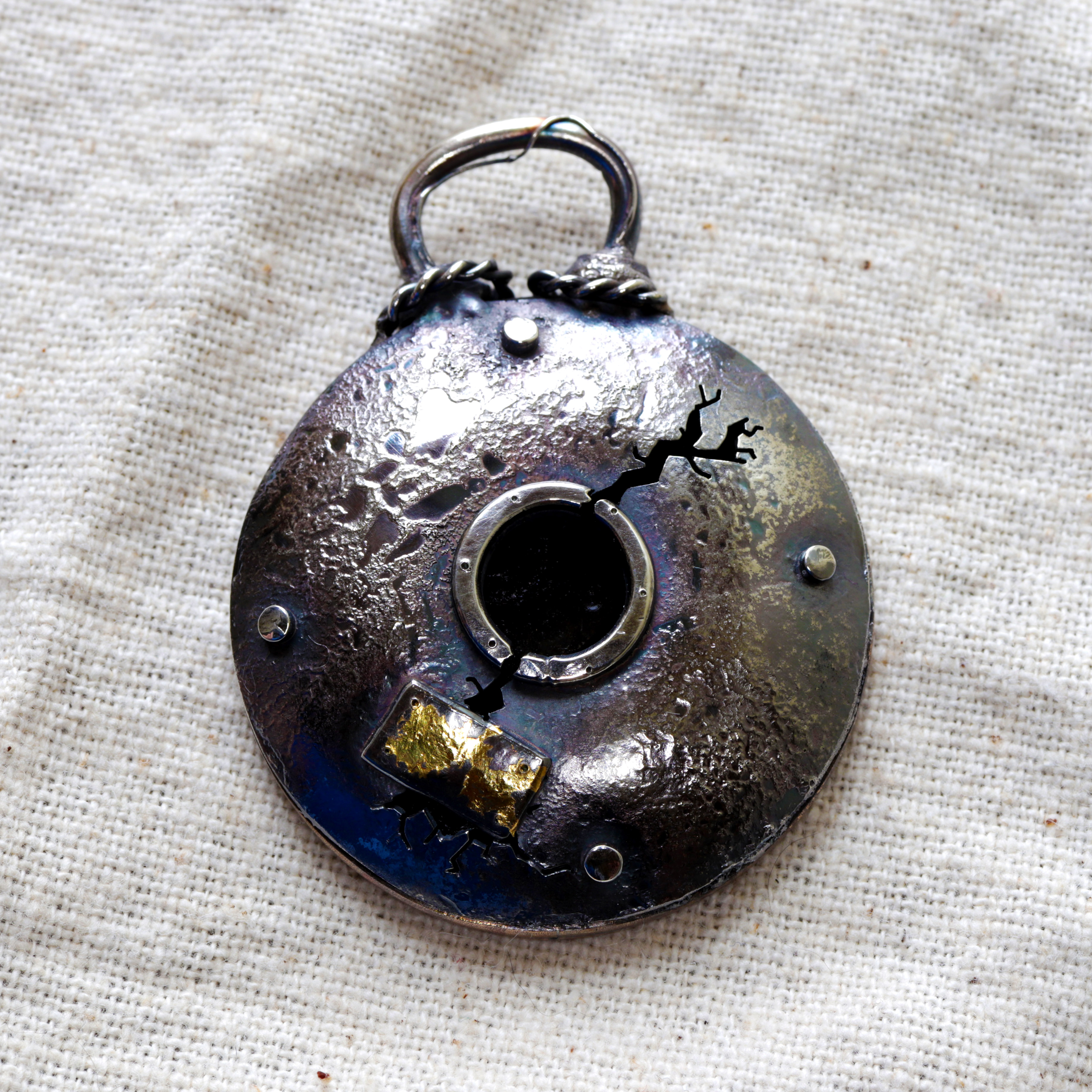 I made this piece trying to get into the steampunk spirit a bit. It could be an ancient machine that used to pull energy from a huge crystal that has long since been removed. Inside, I welded an antique watch movement. Maybe crystals do in fact have energetic properties, but you need a machine to harness and focus that energy properly. Lost technology. About 2 inches square, fine silver and a little bit of 24k gold leaf.