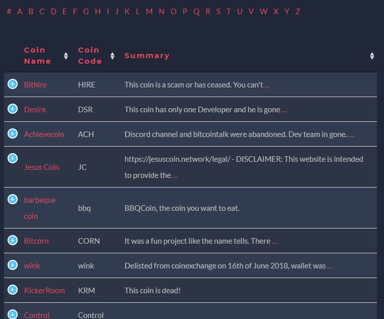 죽은 코인들로 정의된 이유는 다양합니다. 해킹을 당했거나 스팸이거나, 단순한 패러디에 불과하거나 더 이상 살아있지 않거나. 업데이트나 활동이 없으면 Deceased로 분류하는 것 같네요.