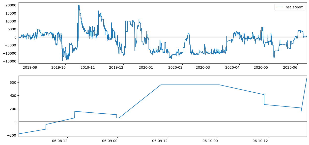 위 그래프(위 전체기간, 아래:최근 3일)는 순 스팀잔고 = 스팀 - 스팀P의 변화를 보여줍니다.