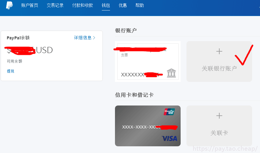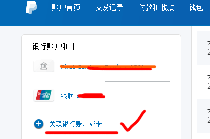 - 登录您的paypal 账户,在账户首页选项中找到银行账户和卡,点击“关联银行账户或卡”: