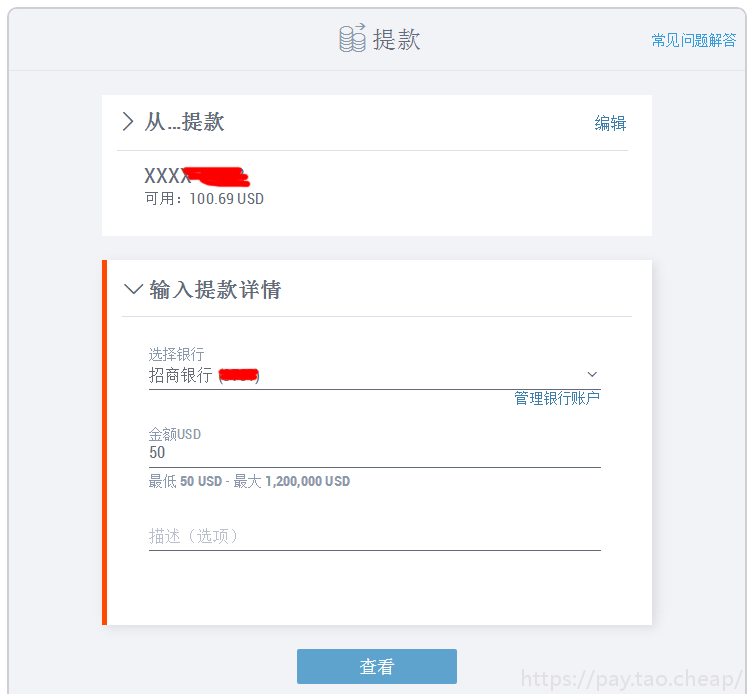 - 点击 “查看”。系统将显示提款信息总结。