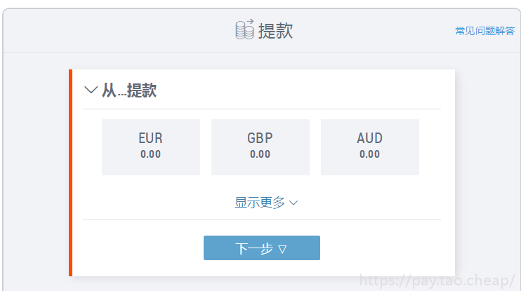 B. 输入您希望提取的金额。请注意您的可用余额,该余额显示在页面顶部。