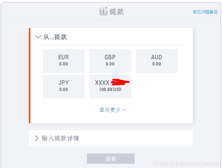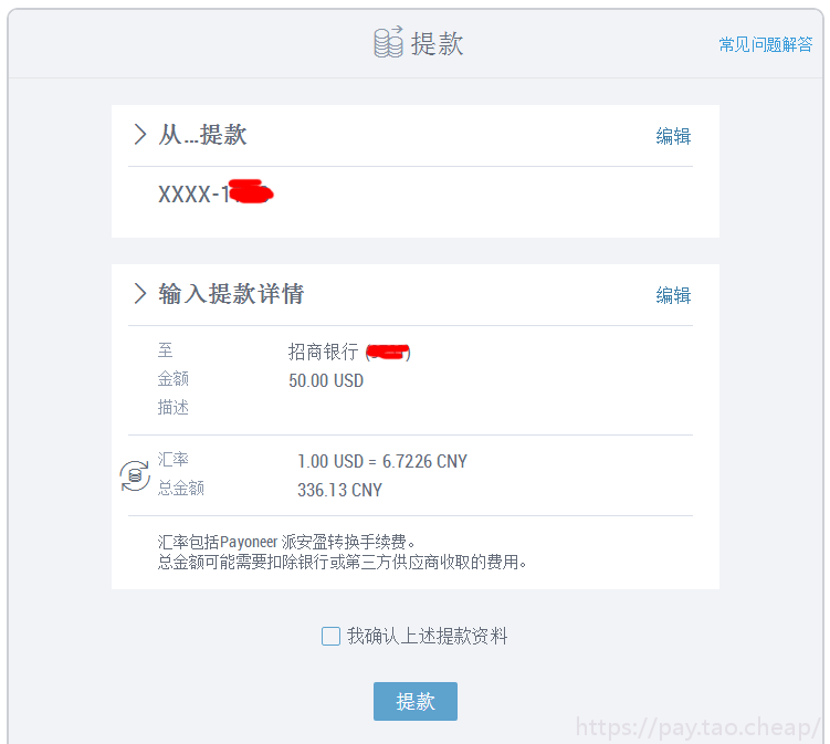 7.确定所有内容正确无误之后,选中复选框 “我确认上述提款资料”并点击 “提款”。
