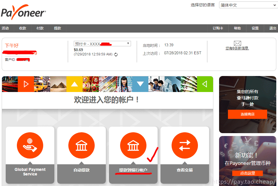 第二步、Payoneer提款到您的国内银行账户