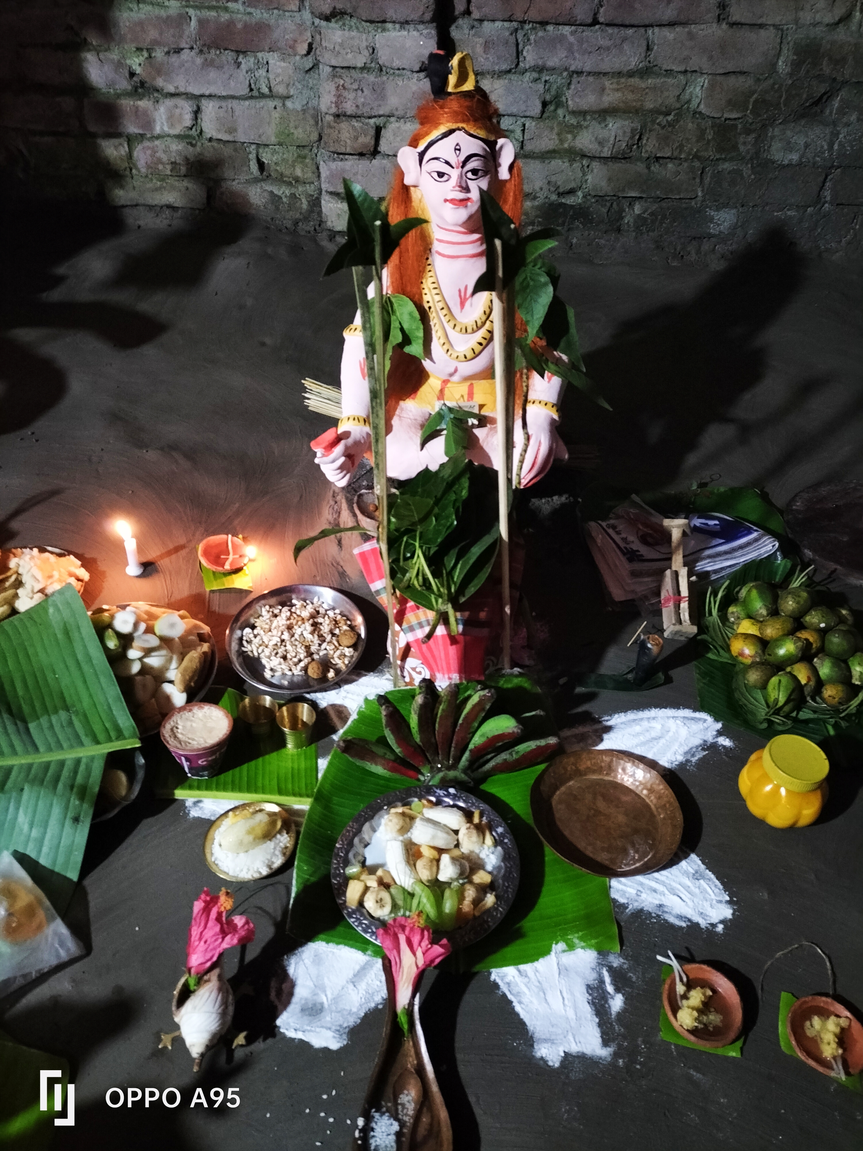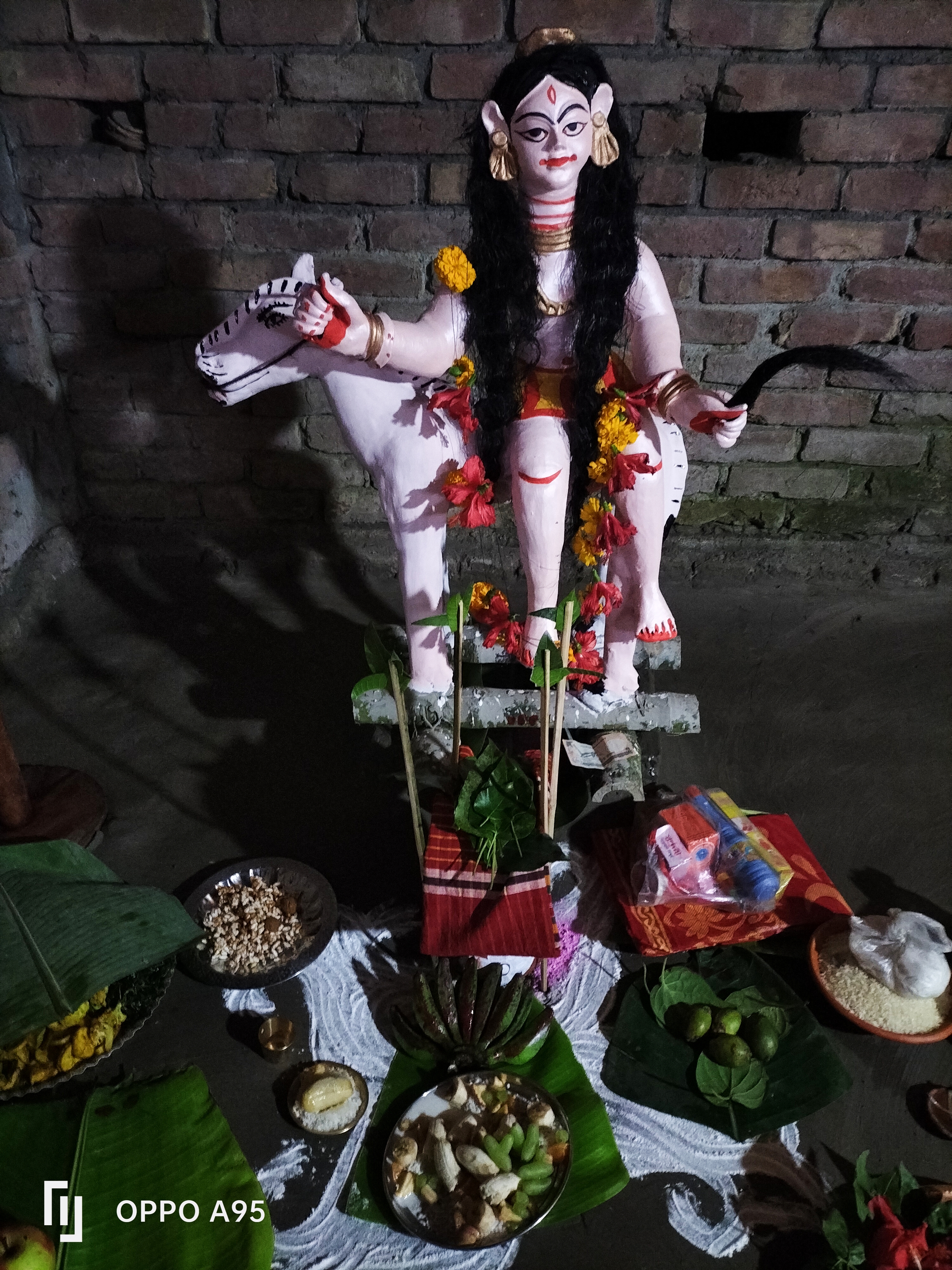 পূজা হয়েছে তিনটে সন্ধ্যা সাতটায় প্রথম শুরু হয় মহাদেব পূজা।মহাদেব পূজার পর হয় শীতলা পূজা।শীতলার জন্য সাদা পাঠার সাথে সাদা কবুতরের বাচ্চা ও ছিলো।