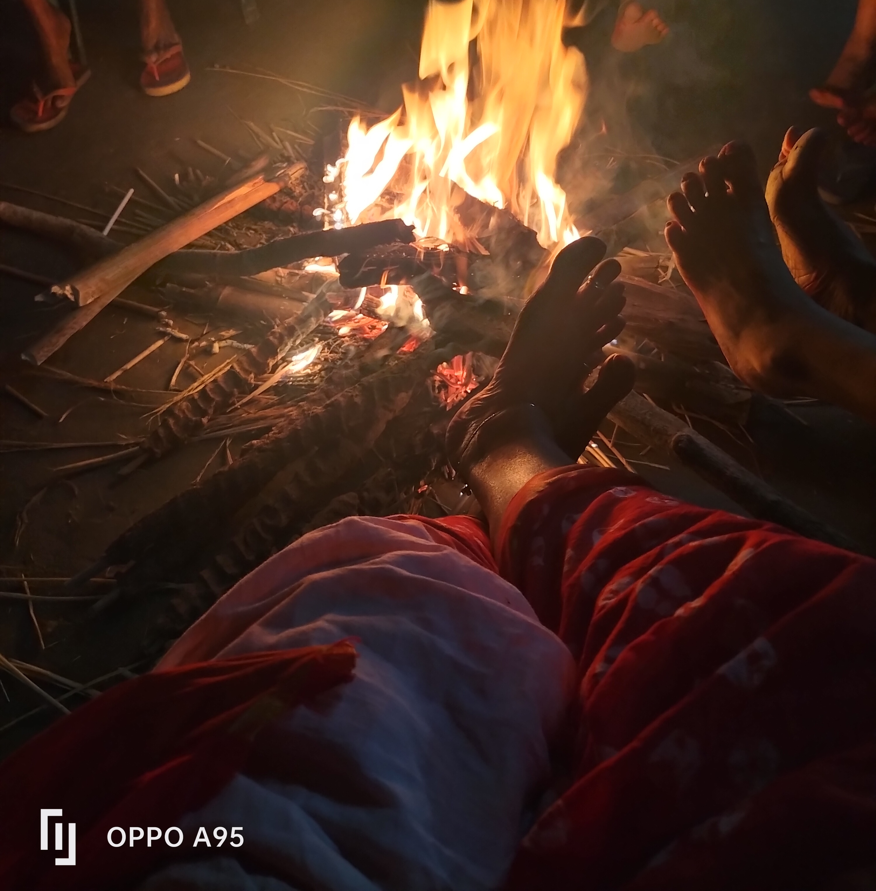 কালীপূজার জন্য সবাই অপেক্ষায় রইলাম কিন্তুু সময়তো কাটছে না।প্রচন্ড ঠান্ডা। যতো রাত বাড়ছে ততই ঠান্ডা বেড়েই চলছে।ঠান্ডায় অস্থির হয়ে গেছি সবাই। এর মাঝে এলাকার এক ব্যাক্তি কাঠ খড়ি দিয়ে দারুণ করে আগুন জ্বালিয়ে দিলেন। আগুন পেয়ে আমরা সবাই চারদিকে চেয়ার নিয়ে বসে আগুন পোহাতে লাগলাম।
