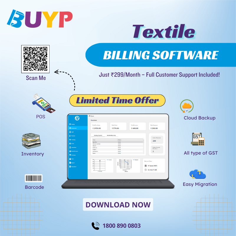 Textile Billing Software 🛍️💻buyp-tech (31)in #buyp • last year ✅ Just ₹299/Month – Full customer support included! ✅ POS, Inventory & Barcode Support 📦🔍 ✅ Cloud Backup & Easy GST Management ☁️📑 ✅ Smooth Data Migration 🔄 🔥 Limited Time Offer! 📲 Scan & Download Now! 📞 Call: 1800 890 0803