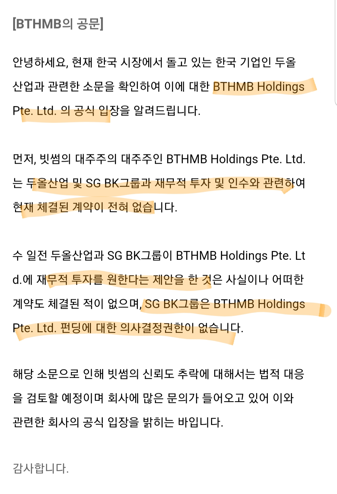 정리를 하자면 과거에 두올산업은 BTHMB HOLDINGS에 재무적 투자를 제안하였지만 계약 하지 않았고, BTHMB HOLDINGS의 모회사의 모회사인 SG BK GROUP의 지분을 인수한 것 뿐이다. SG BK GROUP를 인수 한다해도 손자회사인 BTHMB HOLDINGS의 펀딩에 대한 의사결정권한은 없다. 정도가 될것 같습니다.