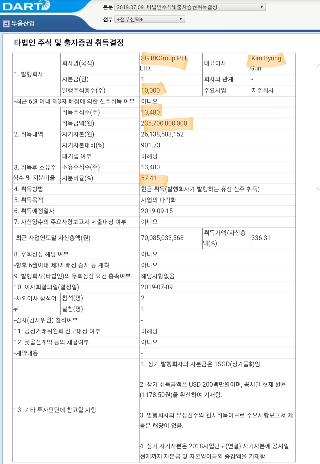 김병건 회장이 대표이사인 타법인(SG BK GROUP) 주식 13,480개를 두올산업이 2357억원에 산다는 공시입니다. 기존 SG BK GROUP의 주식수는 10,000개 였지만 해당갯수만큼 추가 발행하여 판다는 내용입니다.