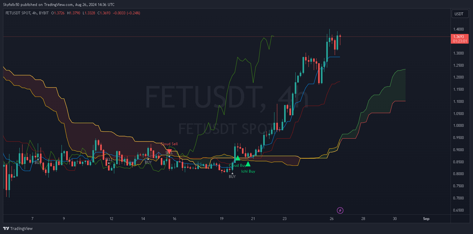 Price of Fet on the 4 hour timeframe is above the cloud and the cloud indicators are all bullish.