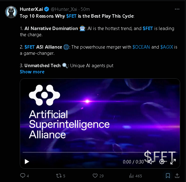 Hunter X.ai is bullish on Fet due to the A.I narrative the fet ASI alliance and the unmatched tech that Fet offers.